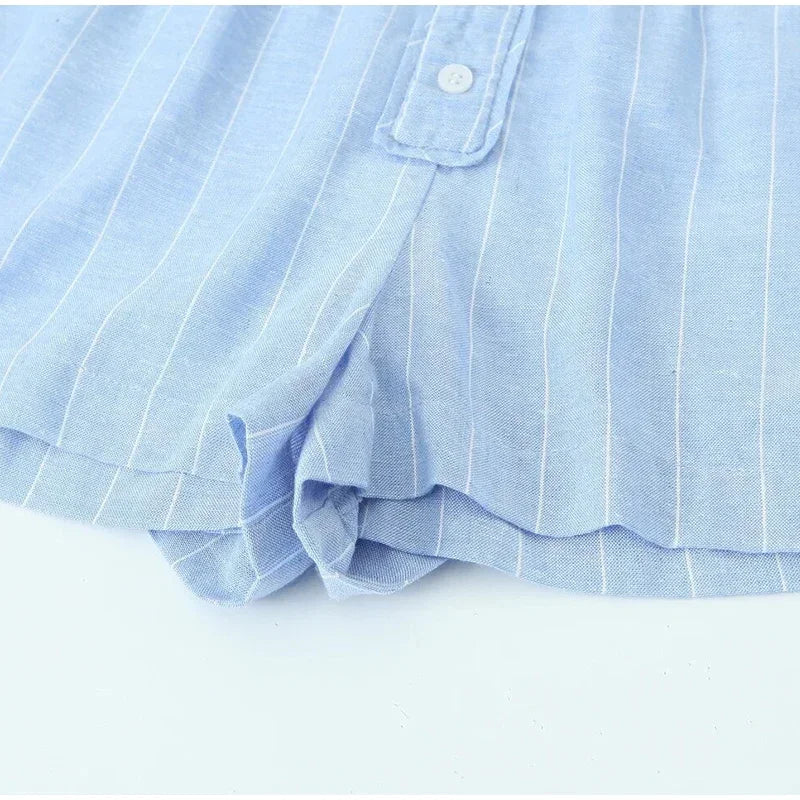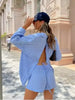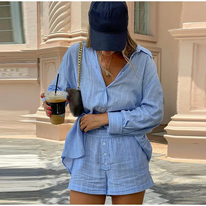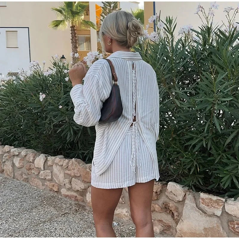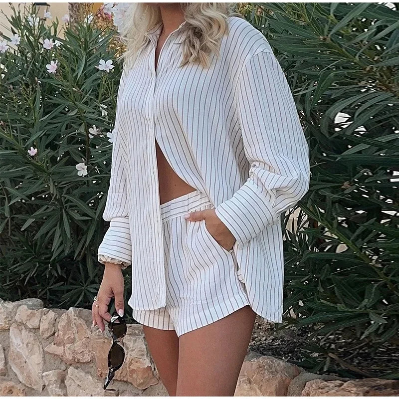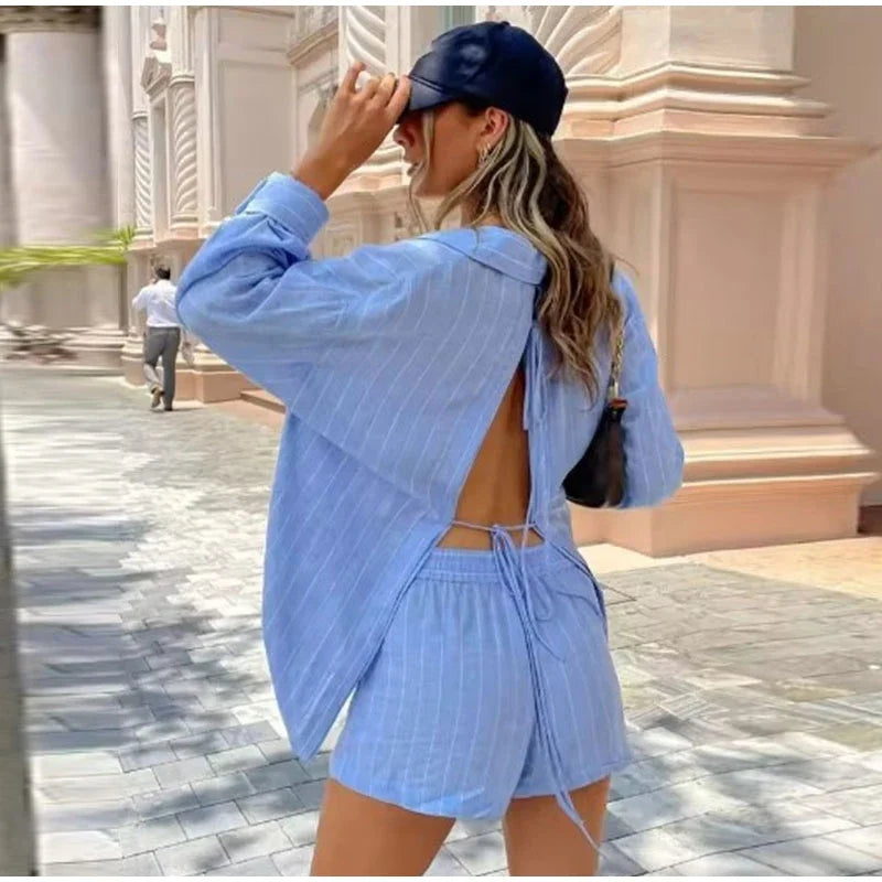 Hnewly Casual Hollow Out Lace Up Shirt Shorts Sets Women Lapel Full Sleeve Buttons Shirts Wide Leg Short Pants Summer Lady Suit