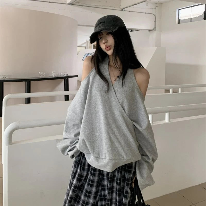 Hnewly Casual Off Shoulder Sweatshirts Women Sexy Korean Style Loose Pullovers Harajuku Y2k Fashion Long Sleeve Sweatshirts