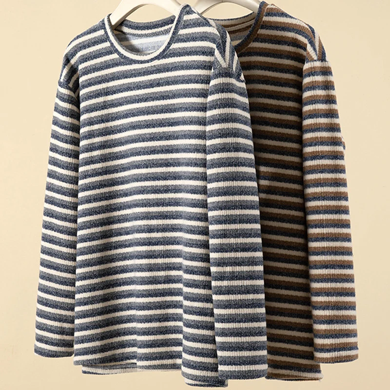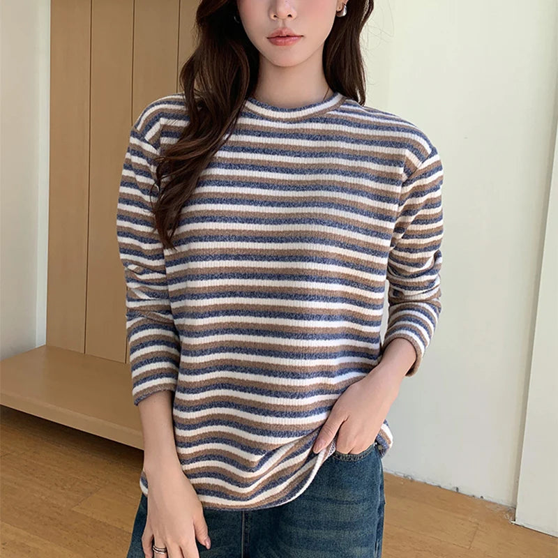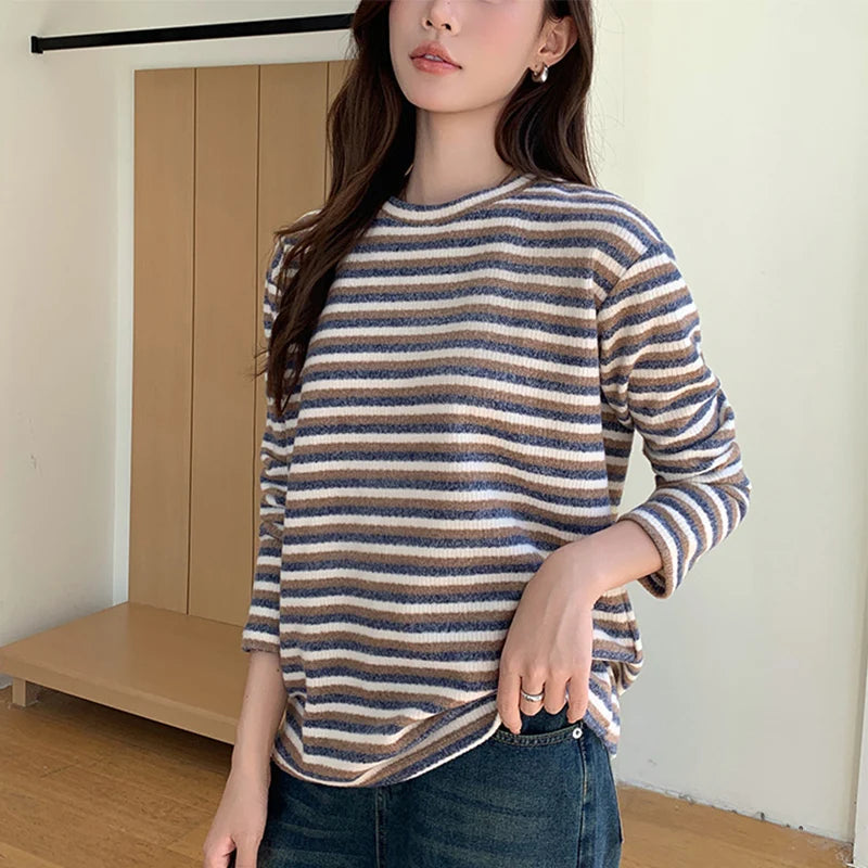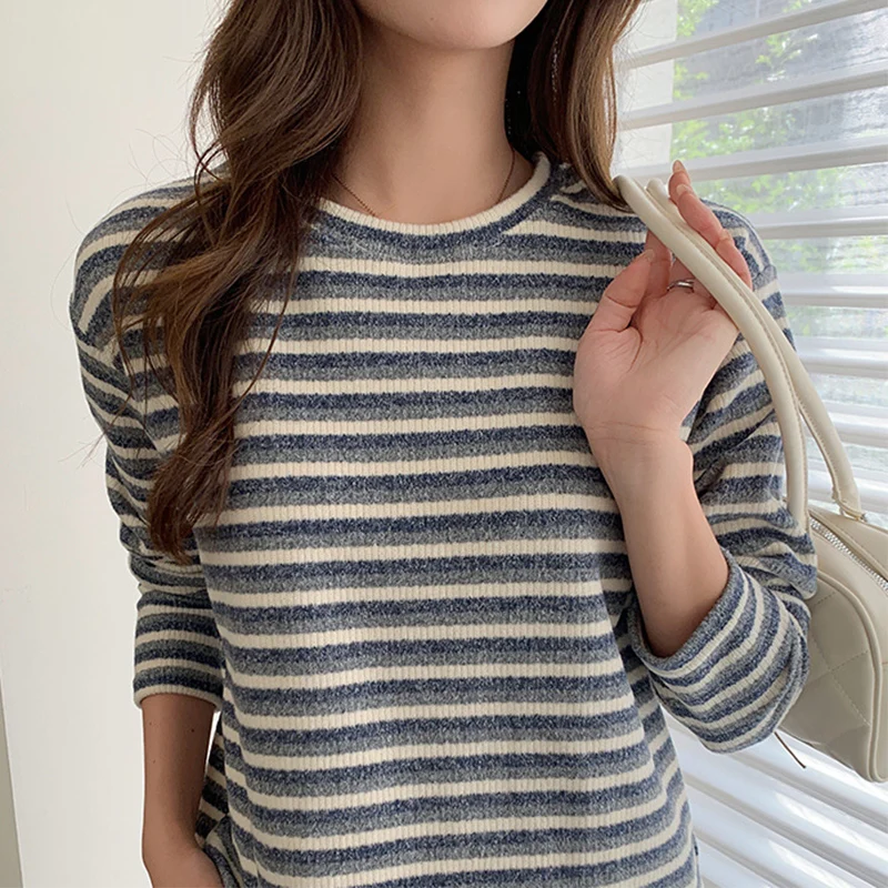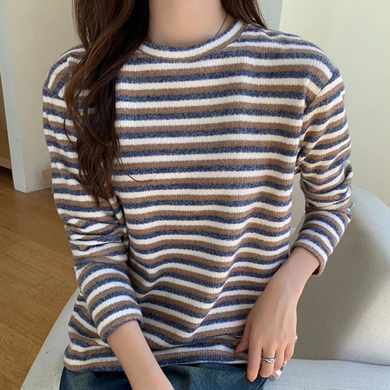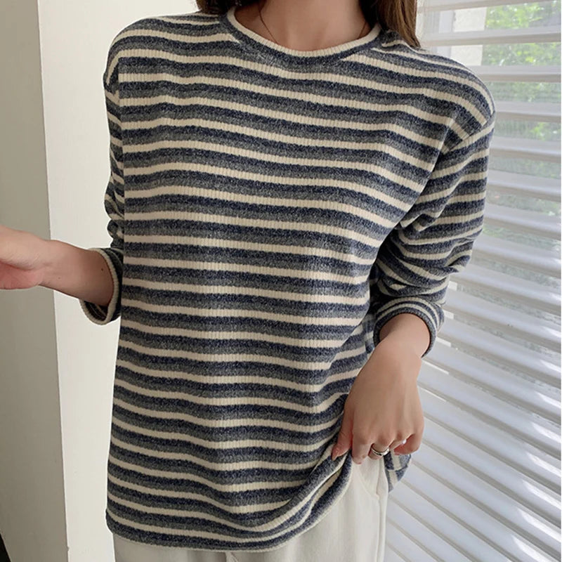 Hnewly Casual Striped Women's Pullovers Spring Autumn Crew Neck Long Sleeve Knitted Sweater Woman Soft Loose Bottoming Tops Women