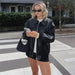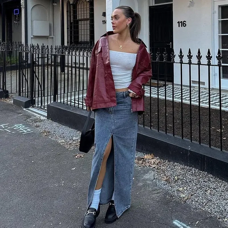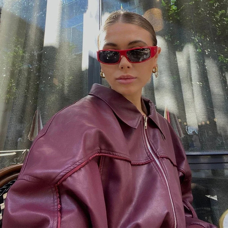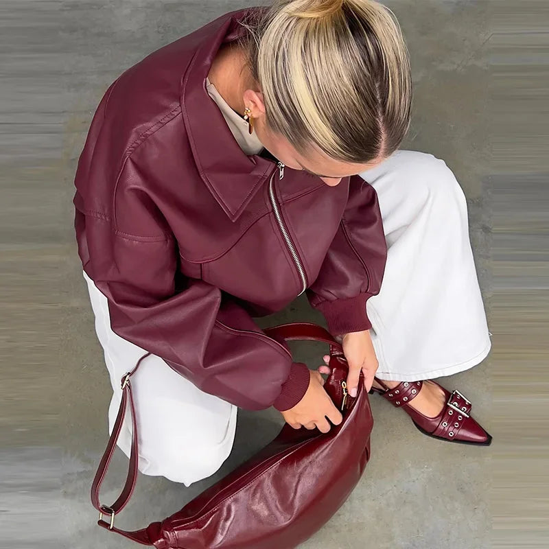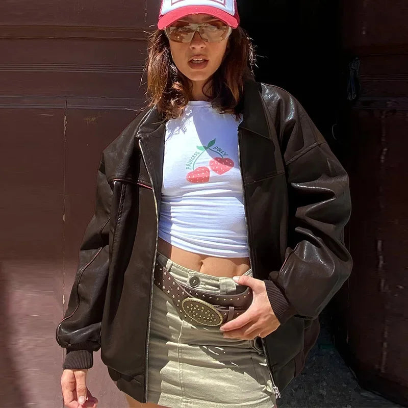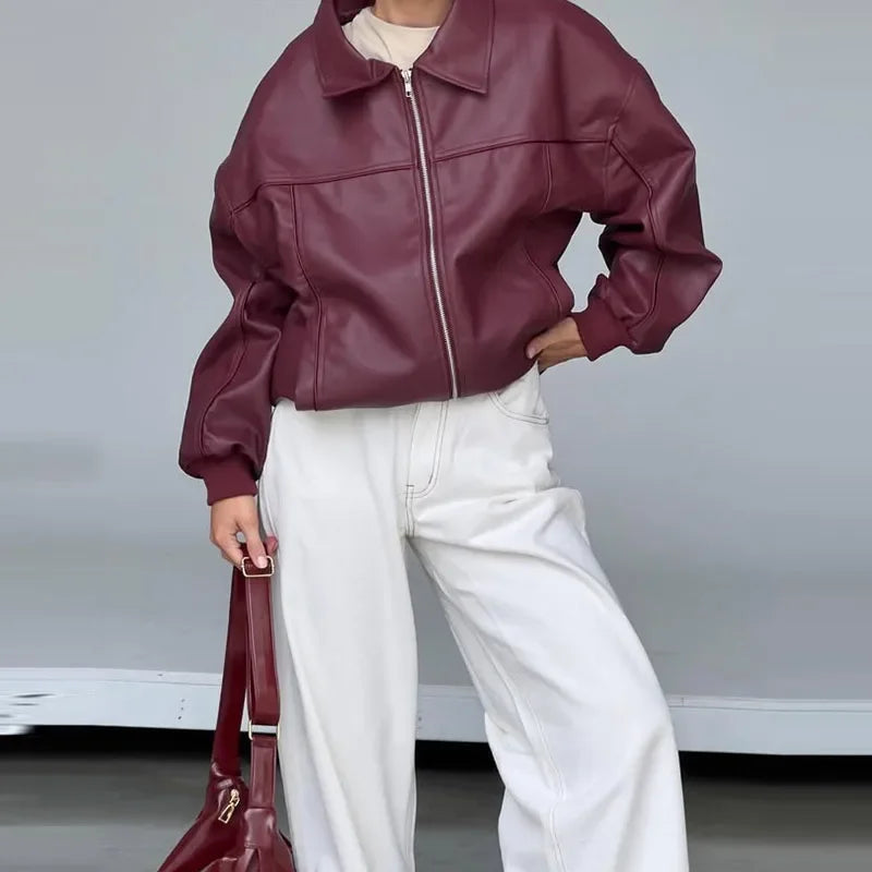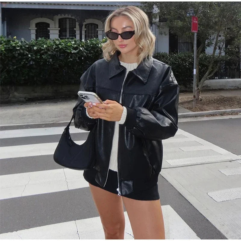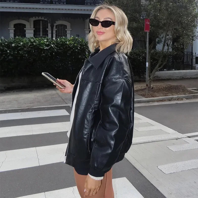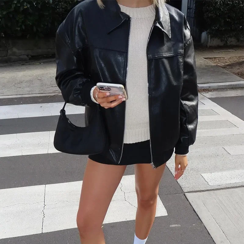Hnewly Casual Women Turn-Down Collar Leather Jacket Loose Full Sleeve Zipper Solid Lady Jackets Autumn Fashion Female Streewear