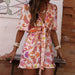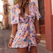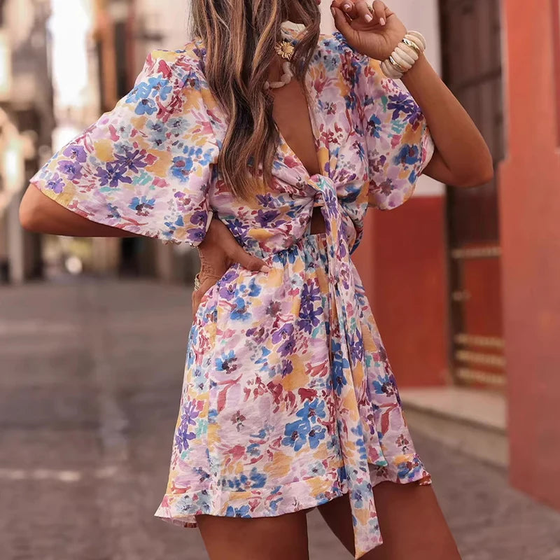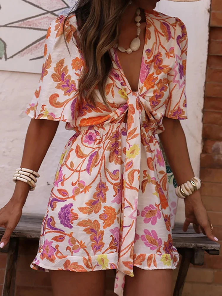 Hnewly Casual Women's Short Sleeved Loose Holiday Playsuits New Pattern Printed High Waisted Jumpsuit Bow Tie Up Loose Summer Rompers
