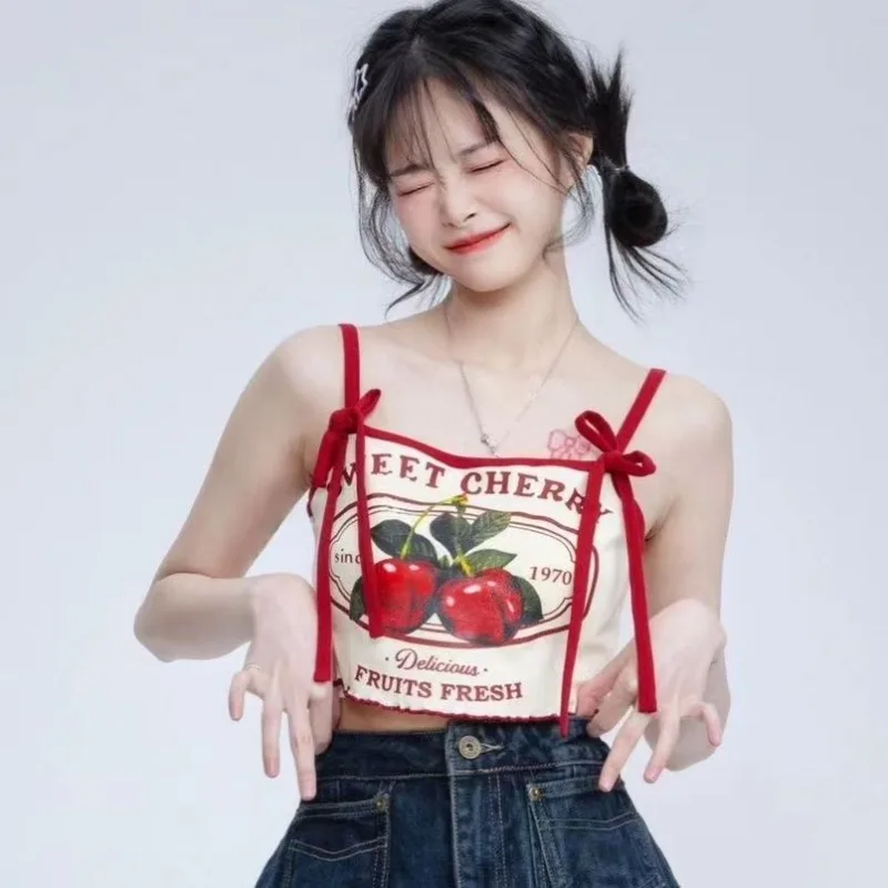 Hnewly Cherry Print Camisole Vest for Women Y2k Fashion Sexy Slim Fit Crop Top T-shirts 2025 Summer New Strapless Tops Mujer