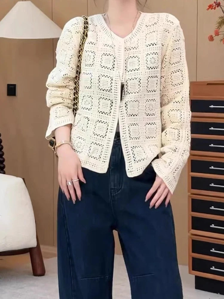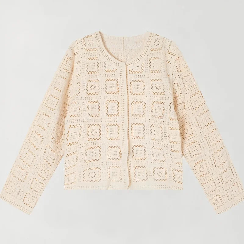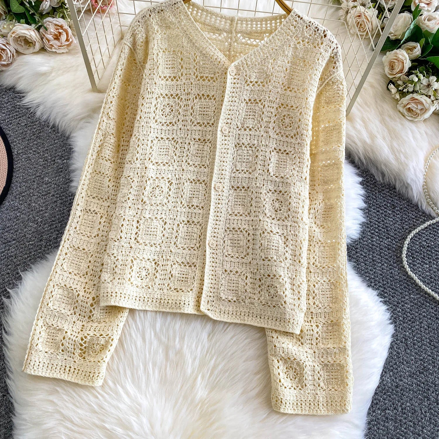 Hnewly Crochet Cardigan for Women Sheer Openwork Button Front Pointelle Knit Jacket Tops Blouse French Chic Boho Vacation Outfit