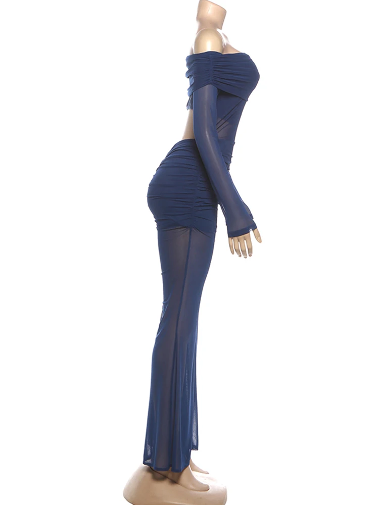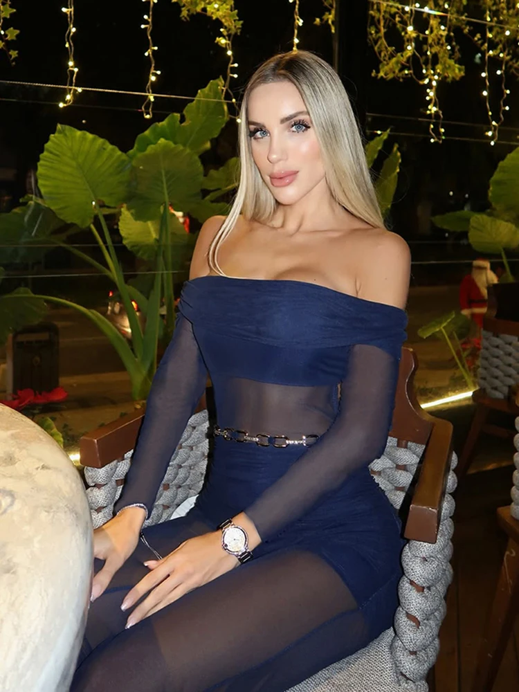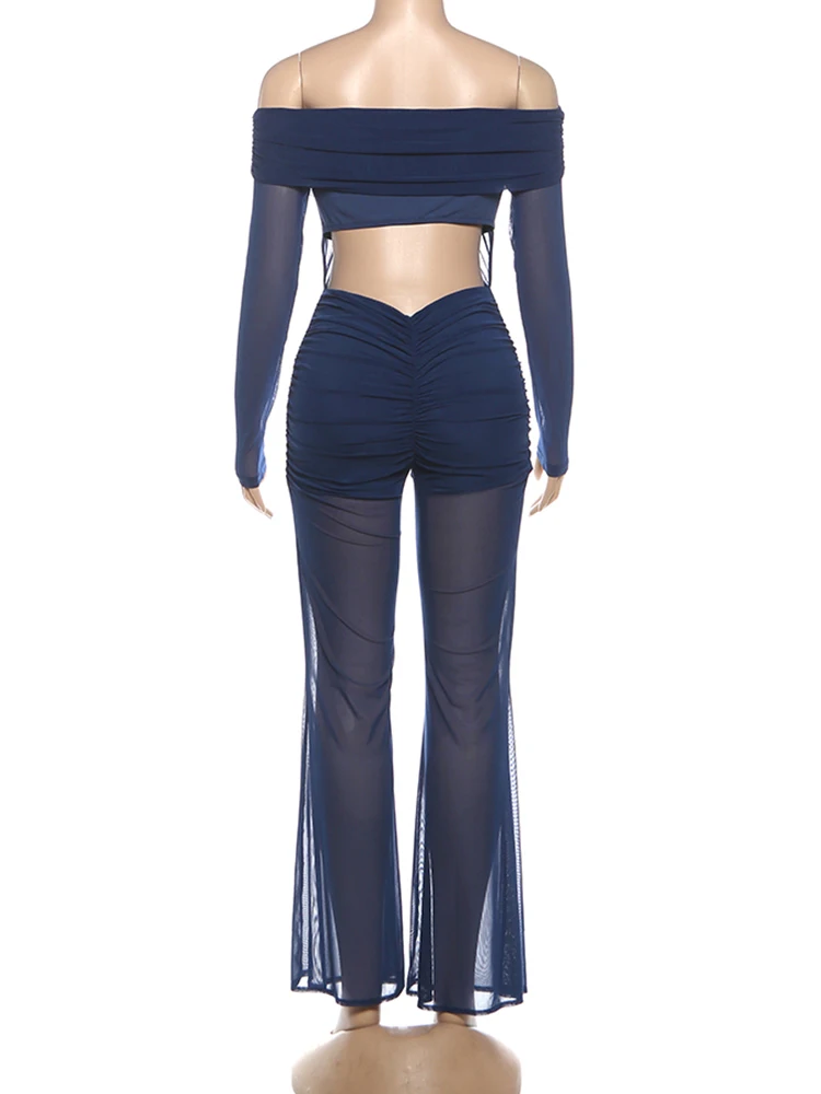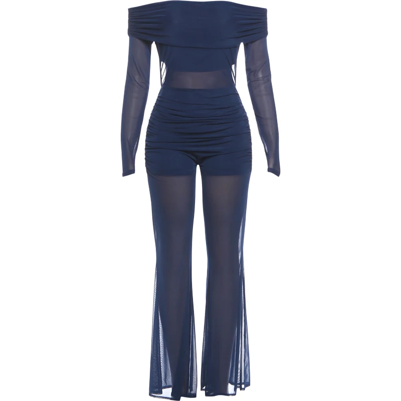 Hnewly Cutenew Backless Slash Neck Jumpsuit Women Elegant Mesh Patchwork Ruched Sexy Stretch Slim Hottie Clubwear Flare Overalls