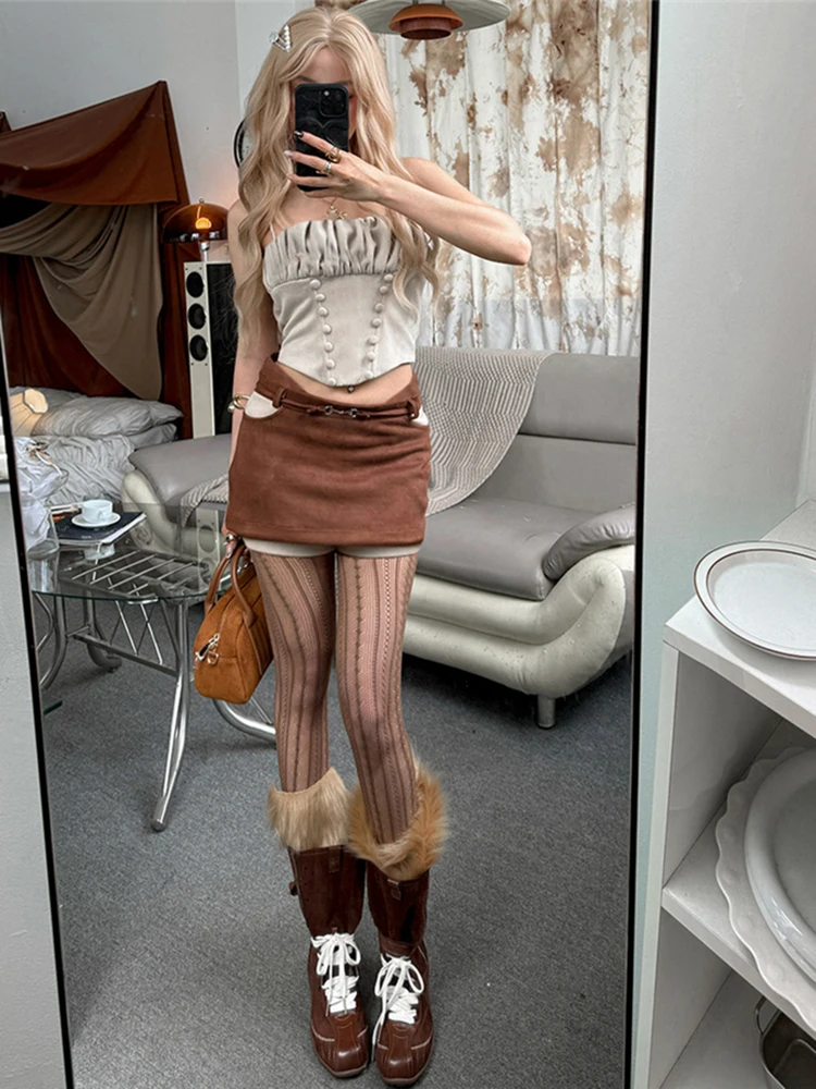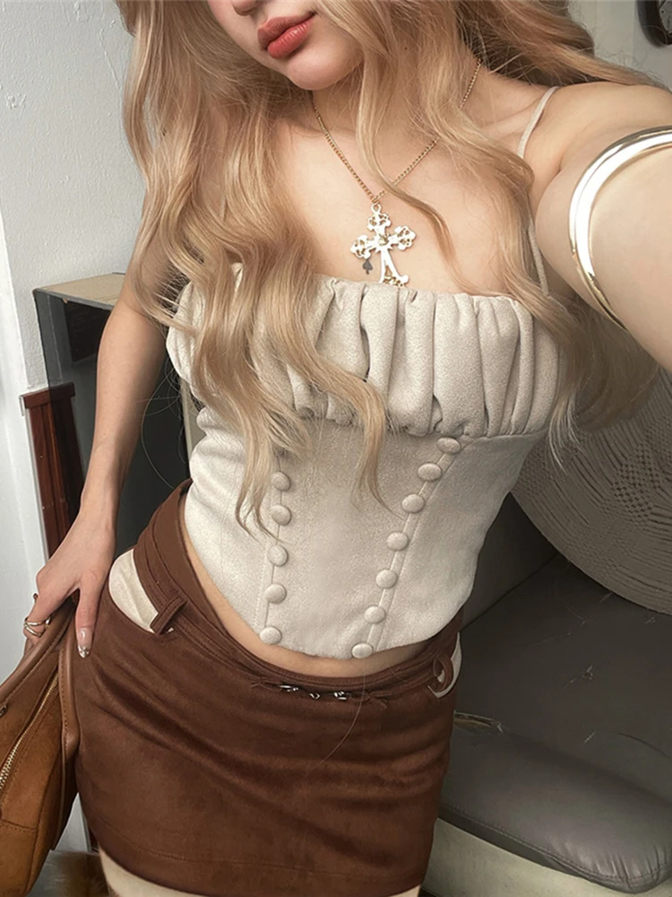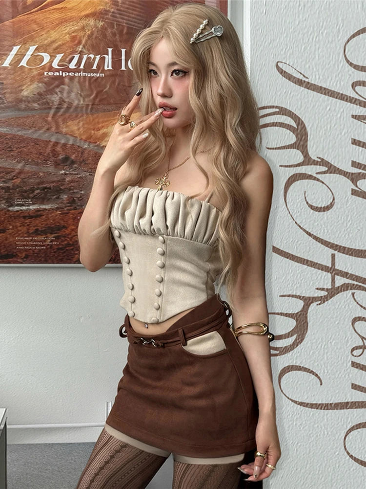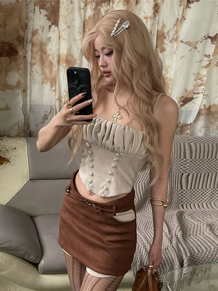 Hnewly Cutenew Fashion Hottie 2 Piece Set Women Ruched Double-Breasted Camisole+Patchwork Peach Hip Skirts Matching Skinny Street Suits