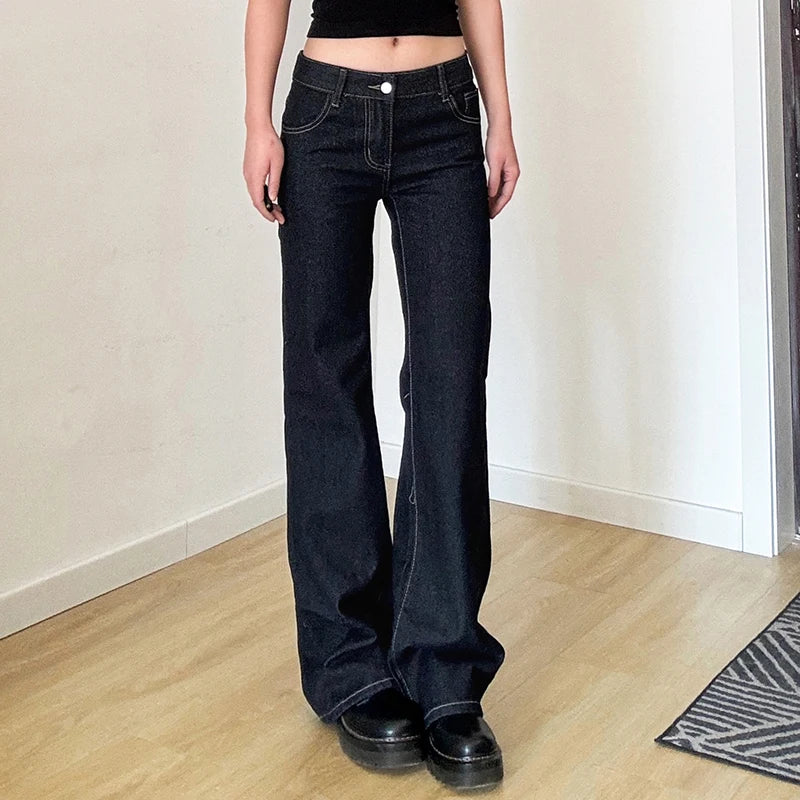 Hnewly Dark Blue Basic Jeans Streetwear Letter Embroidery Low Rise Straight Denim Pants Women Korean Style Baggy Casual Trouser