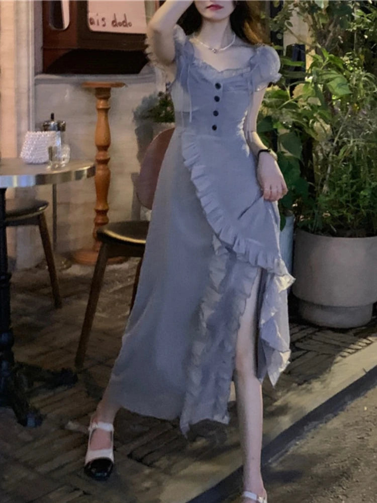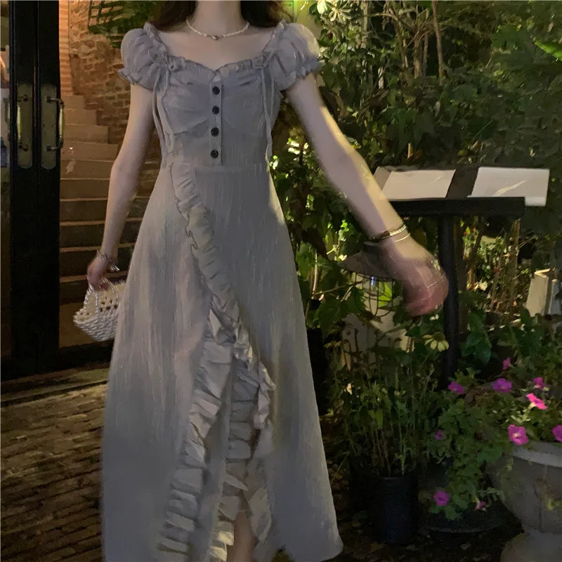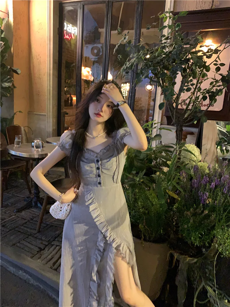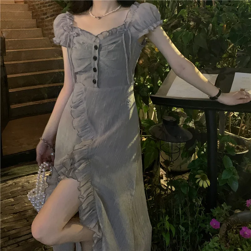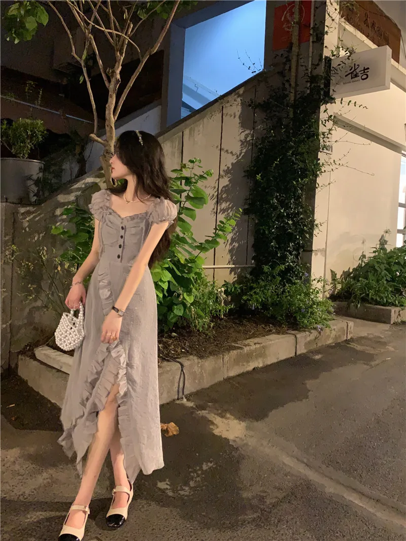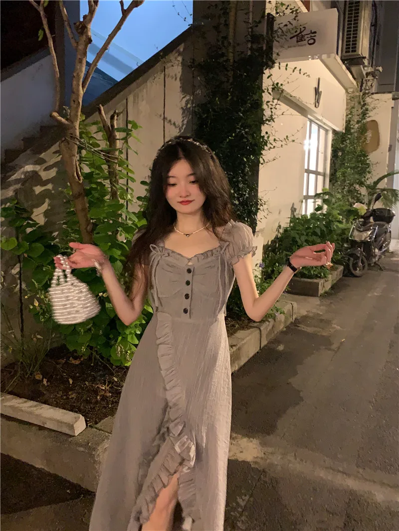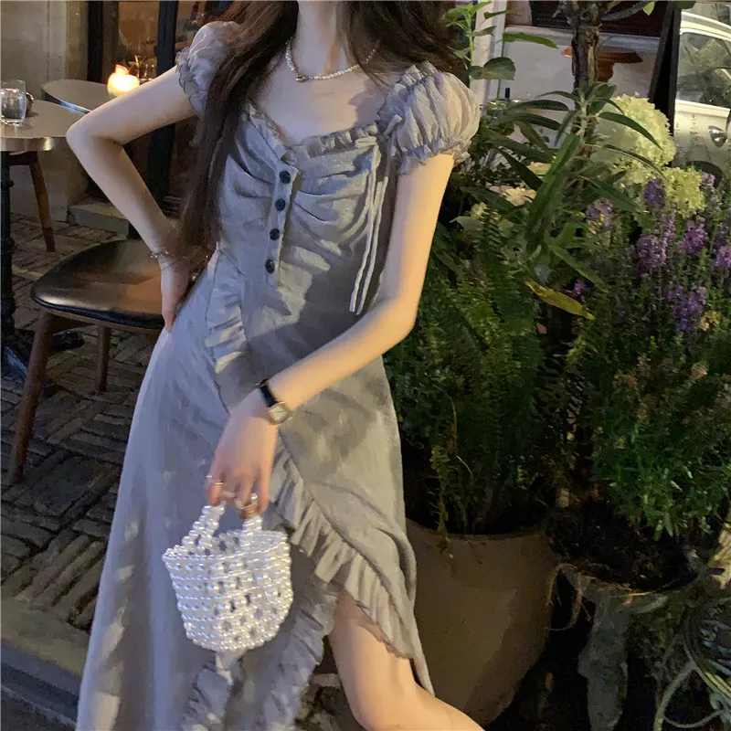 Hnewly Dress Women Sweet Streetwear Buttons Ruffles Irregular Pure Square Collar Tender Temper Fashion Autumn Ulzzang Literary Unique