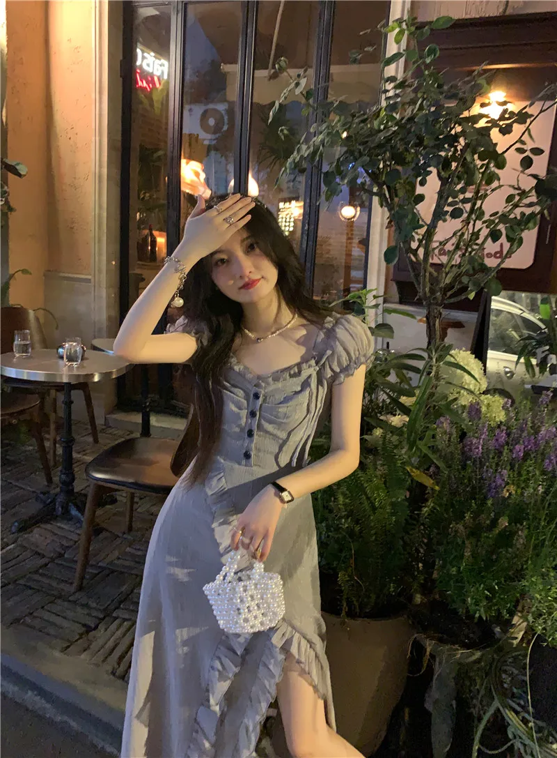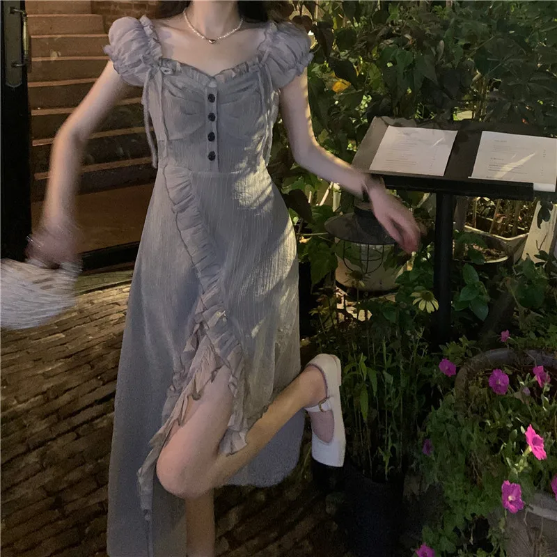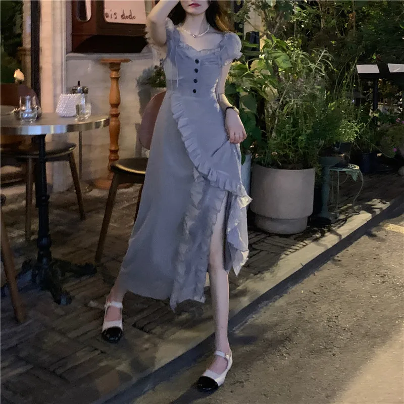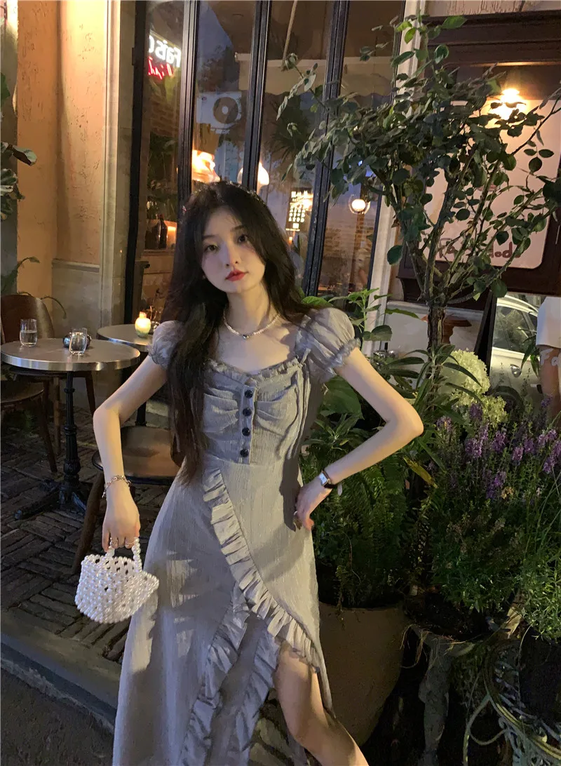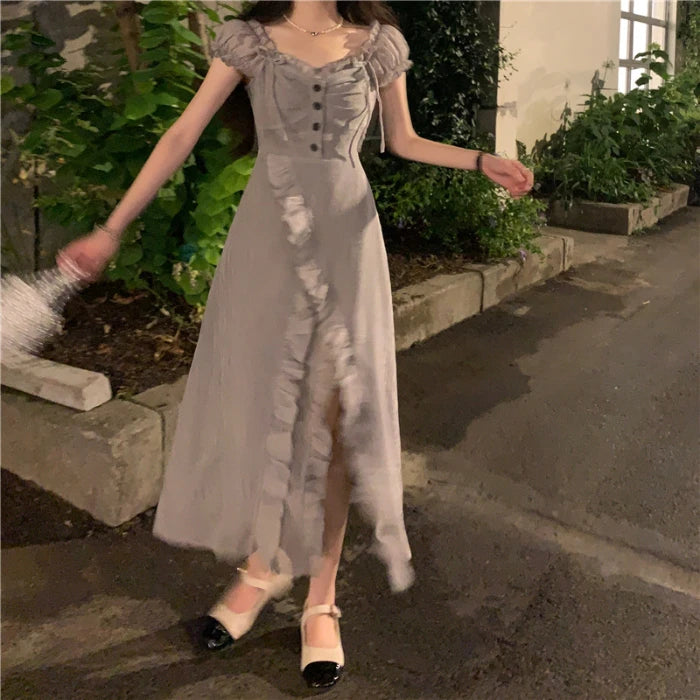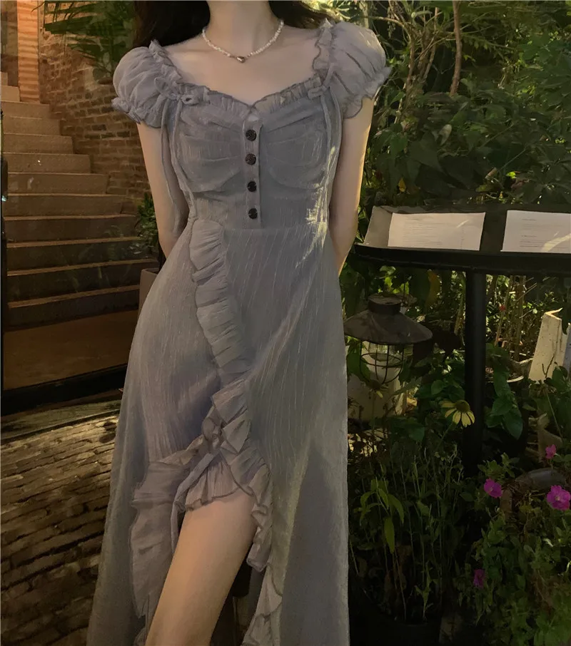 Hnewly Dress Women Sweet Streetwear Buttons Ruffles Irregular Pure Square Collar Tender Temper Fashion Autumn Ulzzang Literary Unique