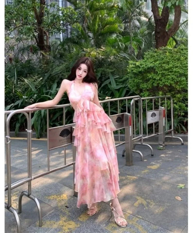Hnewly Dresses Women Ruffles Patchwork Sleeveless Halter Tie Dye Slim Summer Fashion Elegant Temperament Dress Party Holiday