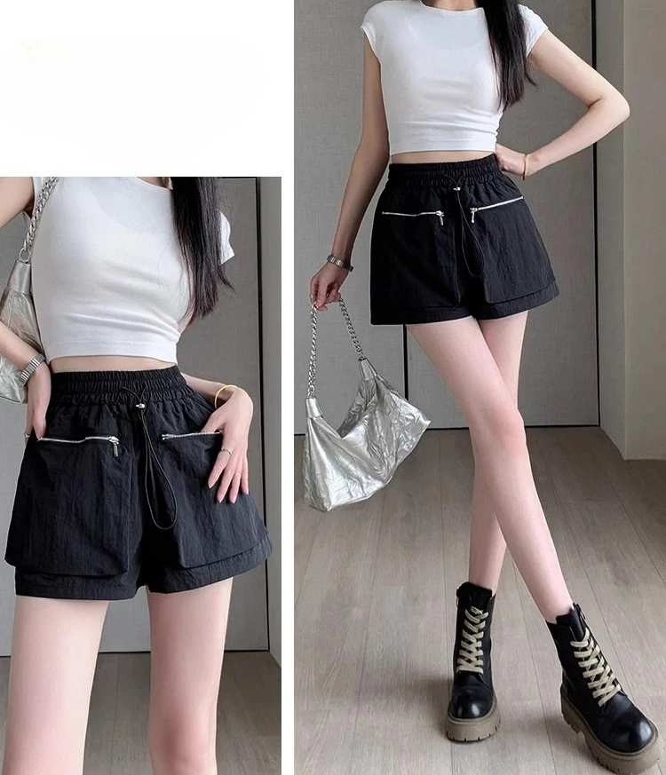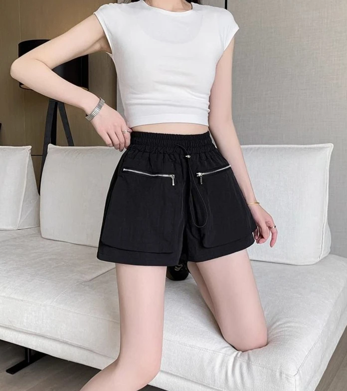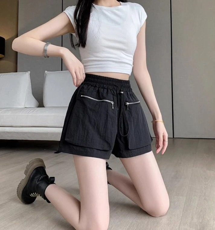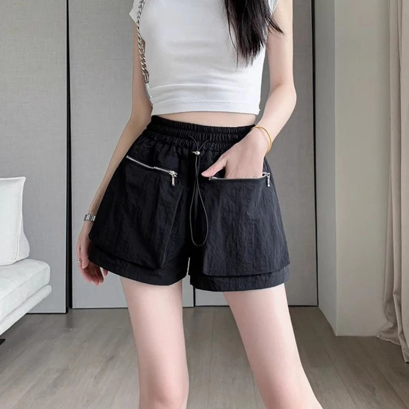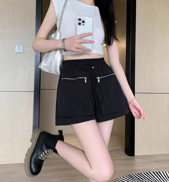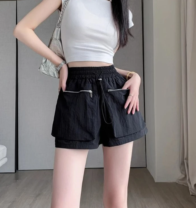 Hnewly Elastic Waist Casual Wide Women's Cargo Shorts Flowy Trend 2025 Korean Style XL Summer Zippered Pocket Baggy Female Short Pants