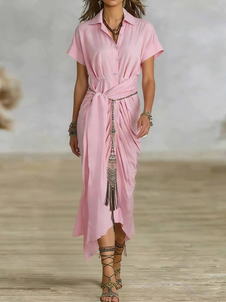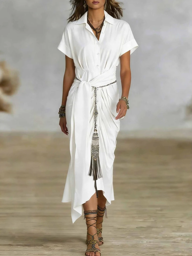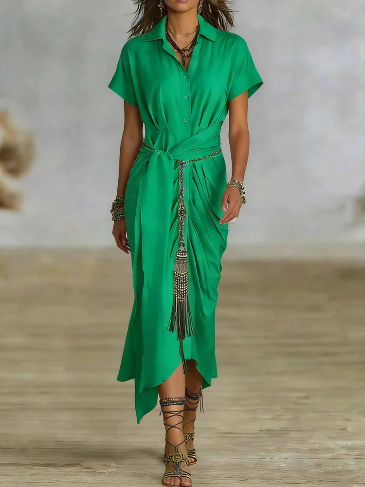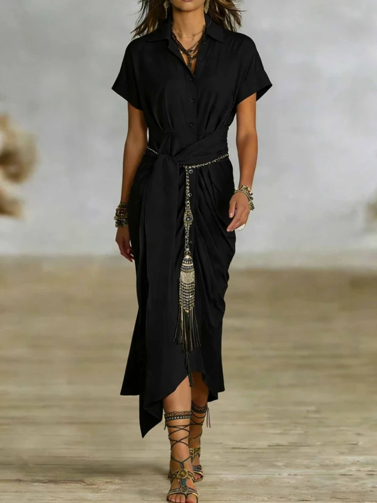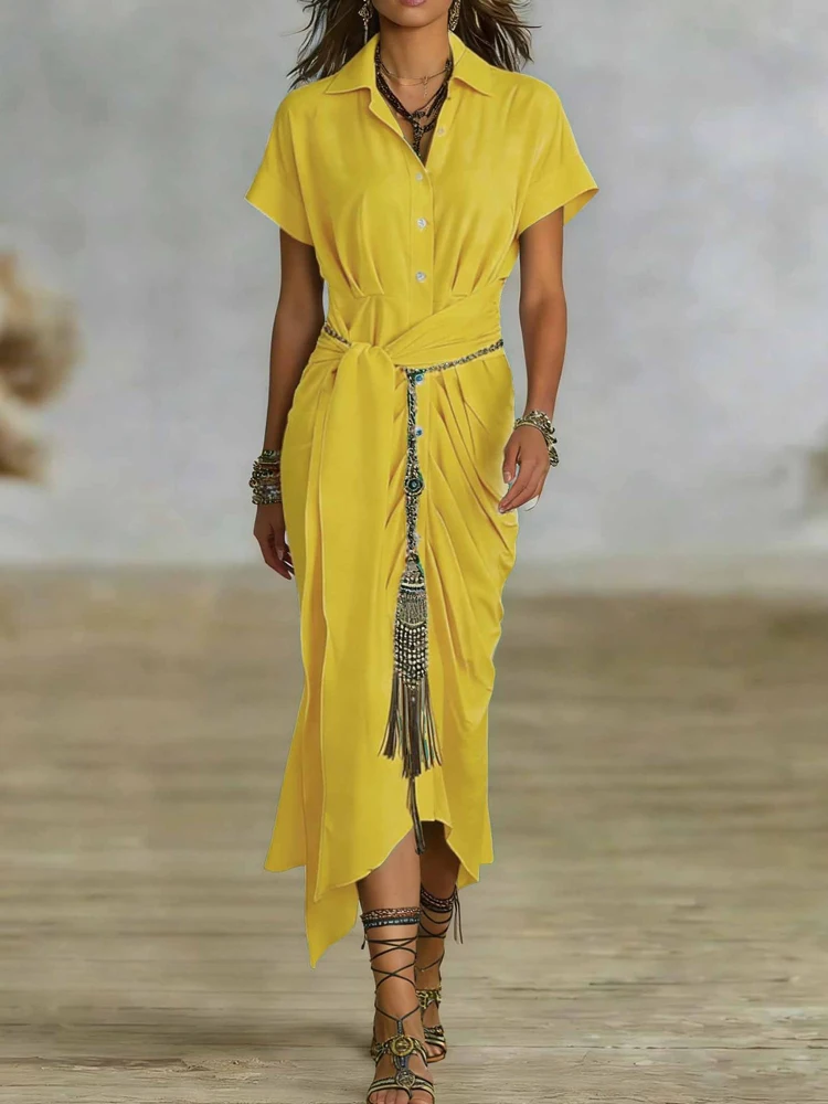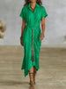 Hnewly Elegant High Waist Commuting Long Dress Spring Summer Women Lapel Short Sleeved Dress Casual Single Breasted Lace Up Shirt Dress