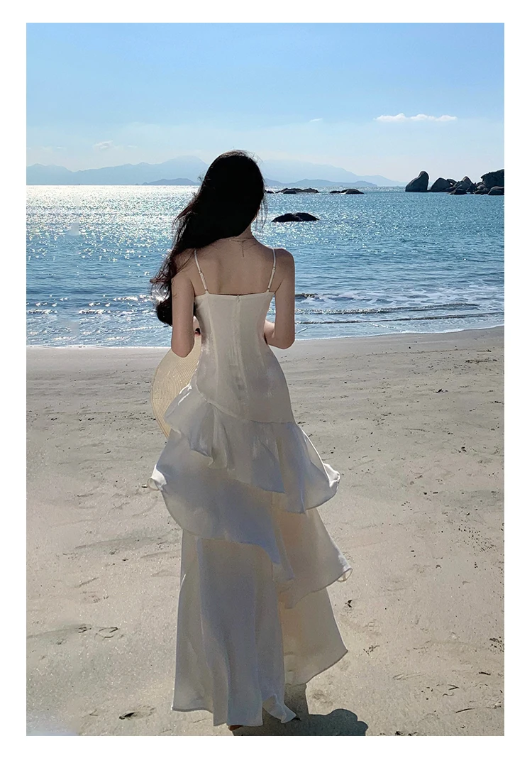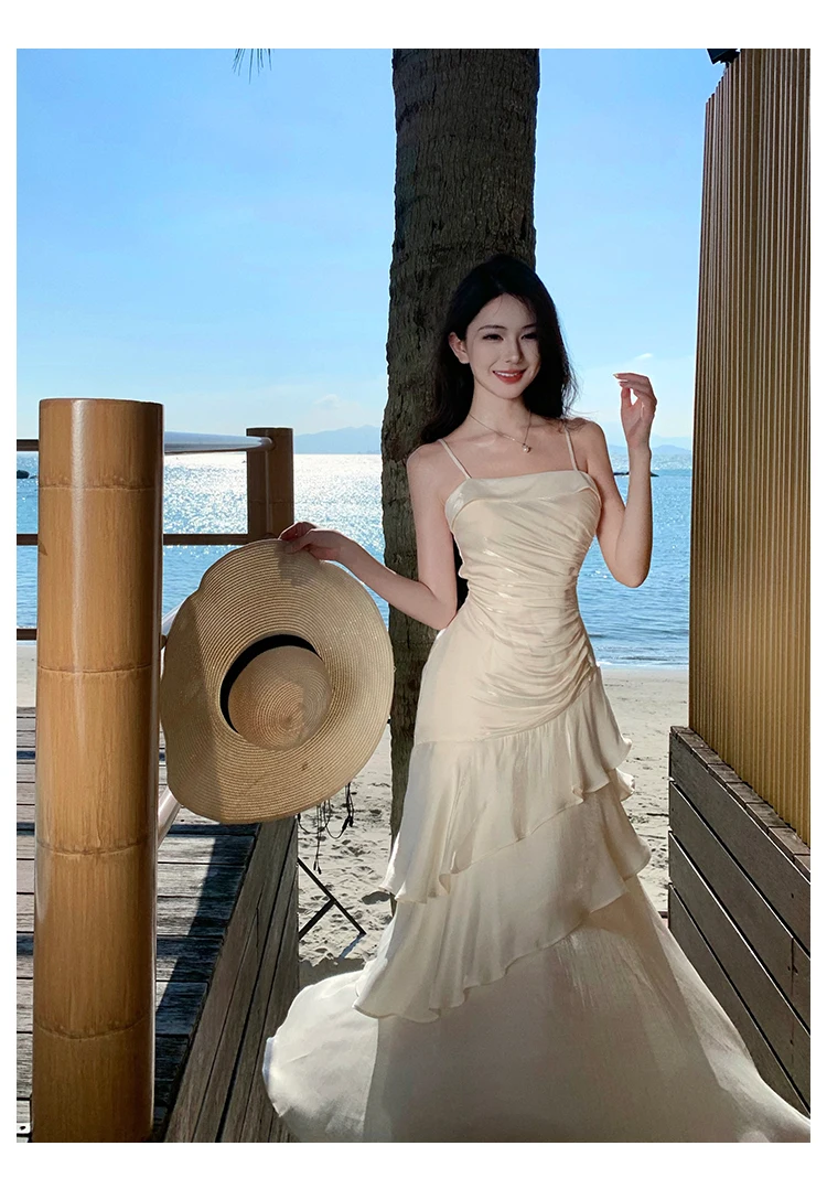 Hnewly Elegant Irregular Spaghetti Strap Womens Dresses Summer Sleeveless Ruffle Birthday Party Long Dress Slim Holiday Beach Vestidos
