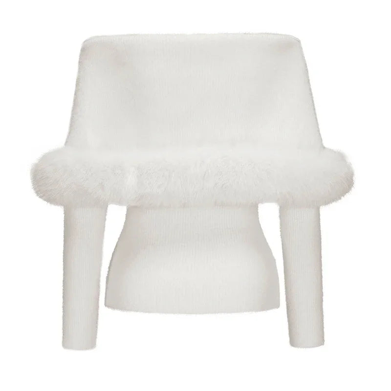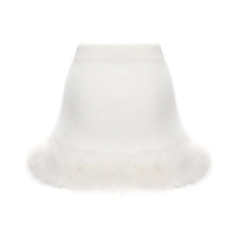 Hnewly Elegant Knitted Fur Patchwork Women's Sweater Skirts Suit Off Shoulder Full Sleeve Lady Set Winter 2 Pieces Set Women New