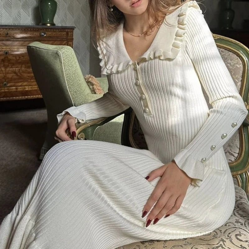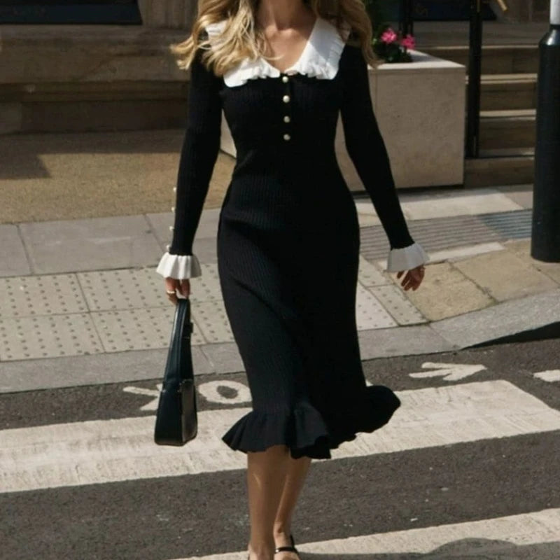 Hnewly Elegant Knitted Long Skirt Women Black Vintage Long Sleeve Party Dresses Sweet Ruffle Patchwork Sweater Maxi Dress Slim