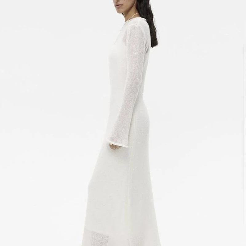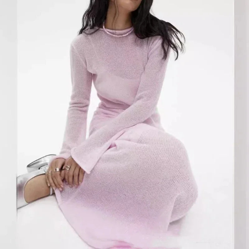 Hnewly Elegant Knitted Sweater Long Dress Women Sexy See Through Mesh Maxi Dress Sweet Fashion Solid Beach Vacation Dresses