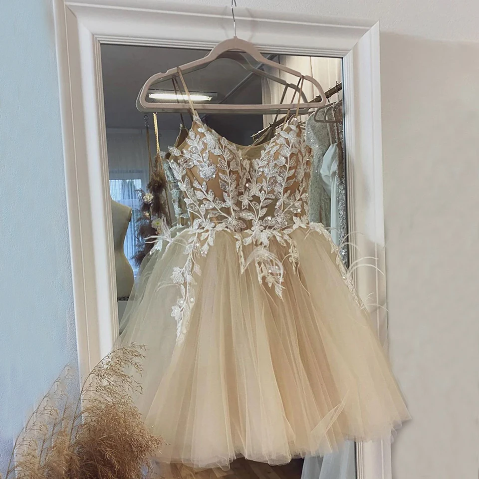 Hnewly Elegant Lace Appliques Short Prom Dress Spaghetti Straps Tulle Formal Party Graduation Evening Gown With Feather formal dress