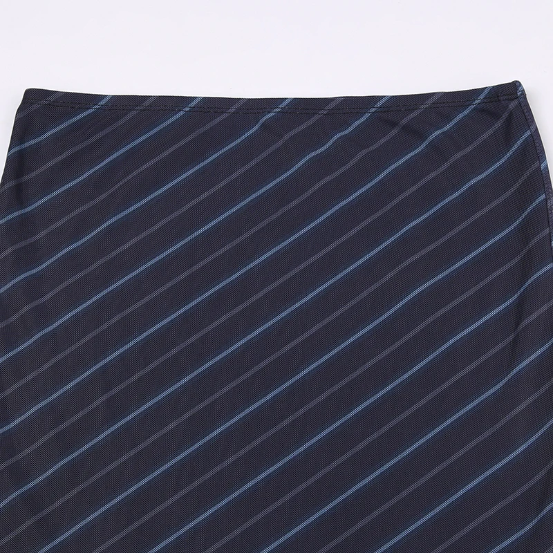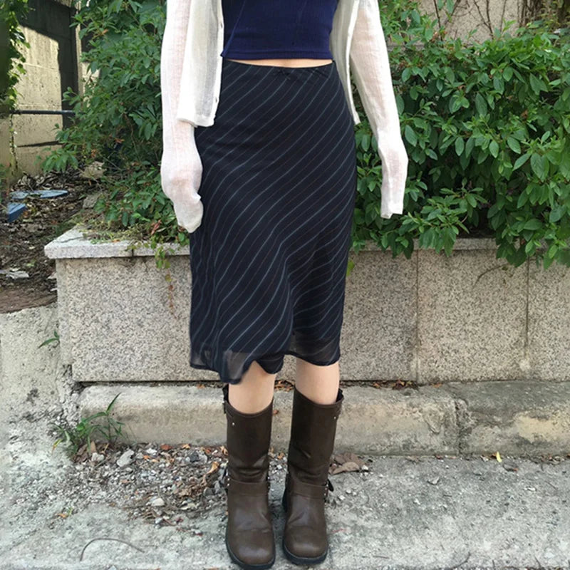 Hnewly Elegant Mesh Striped Print Midi Skirt Cute Bow Stitching Low Rise Straight Skirts for Women Vintage 2000s Clothing Summer