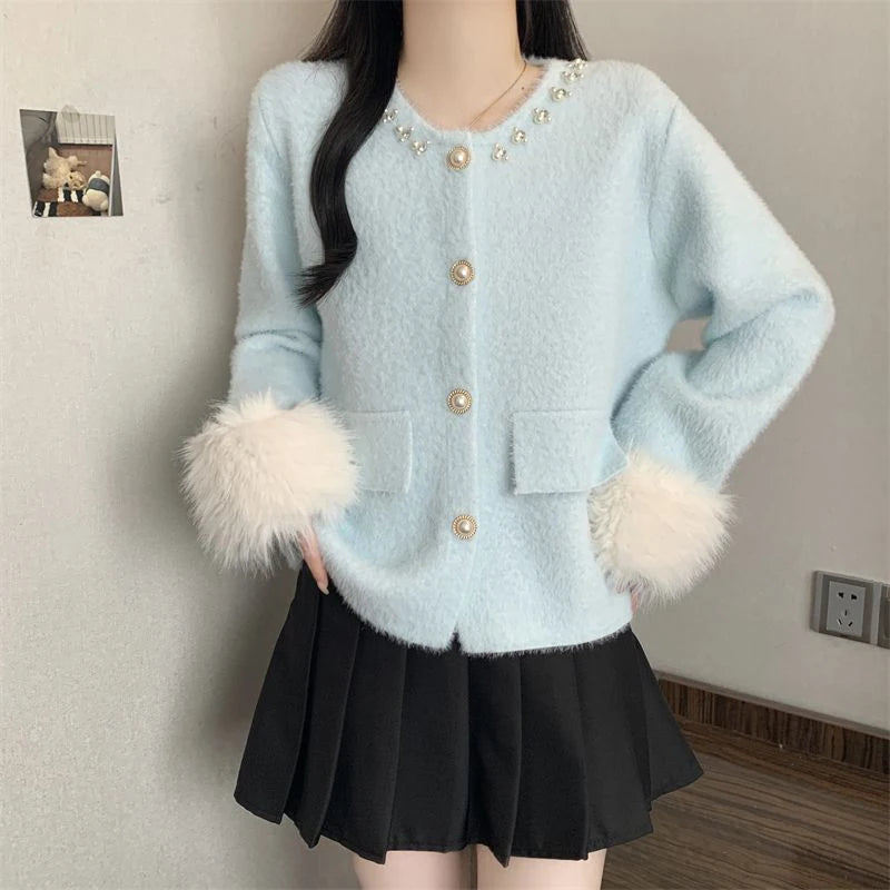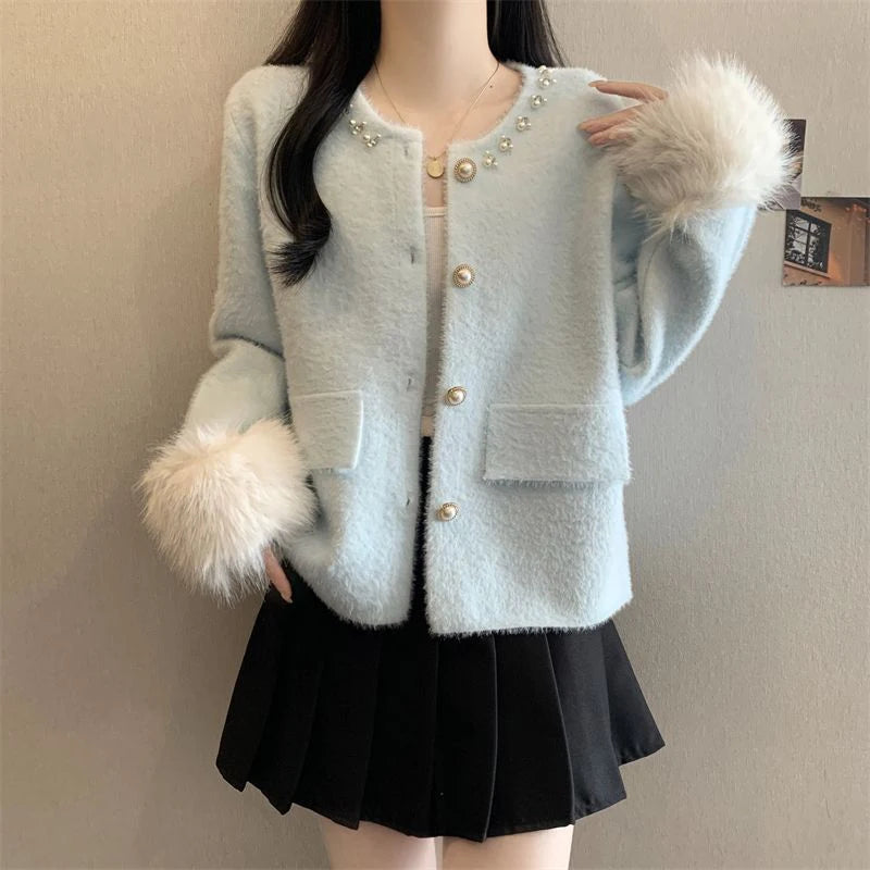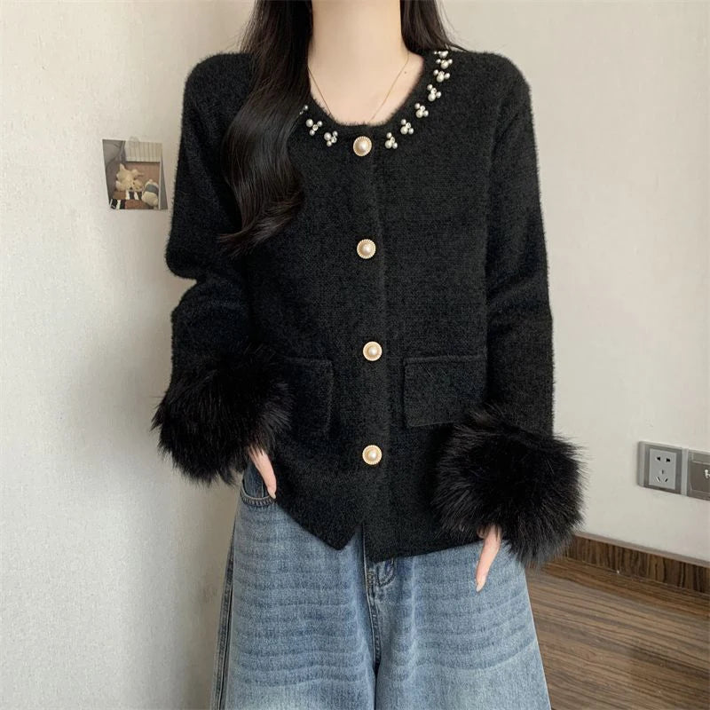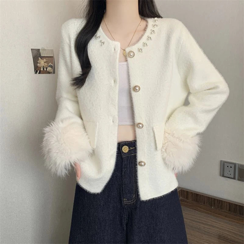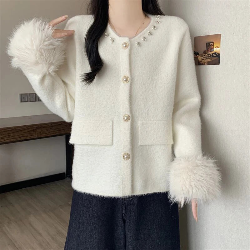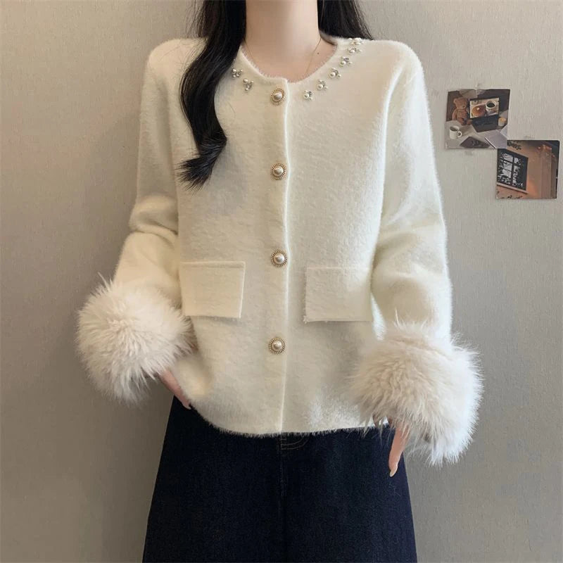 Hnewly Elegant Pearls Sweet Cardigan Women Vintage O Neck Faux Mink Cashmere Knitted Sweaters Korean Casual Long Sleeve Loose Tops