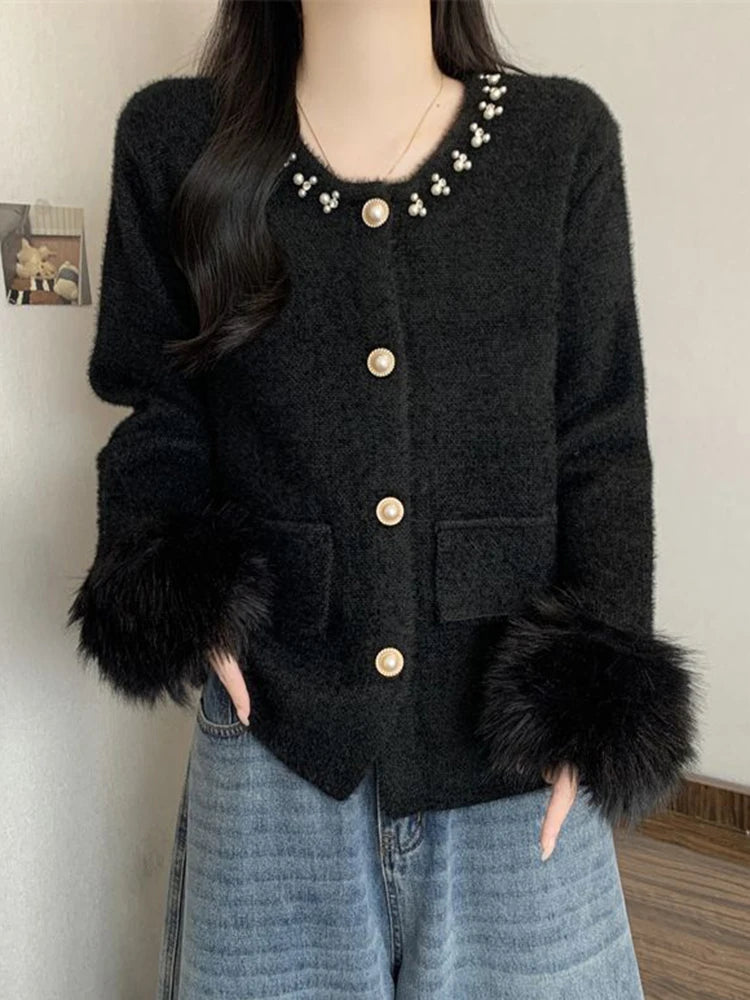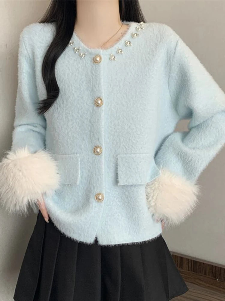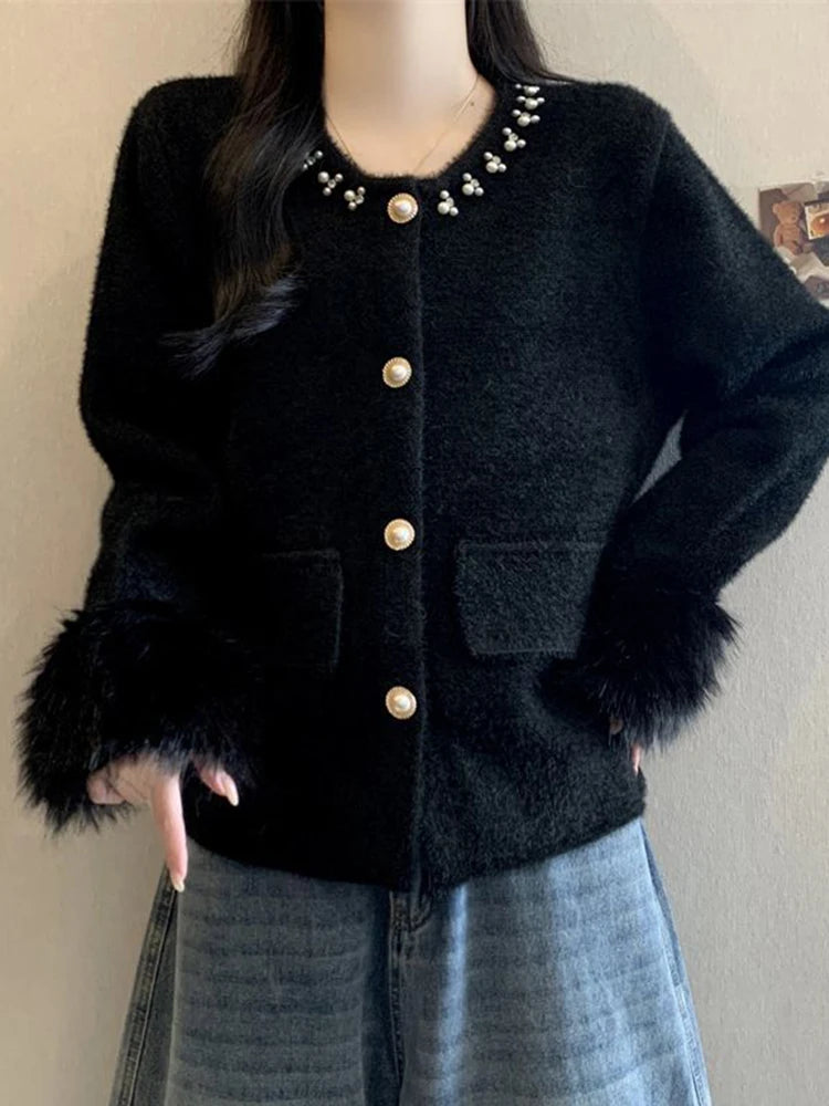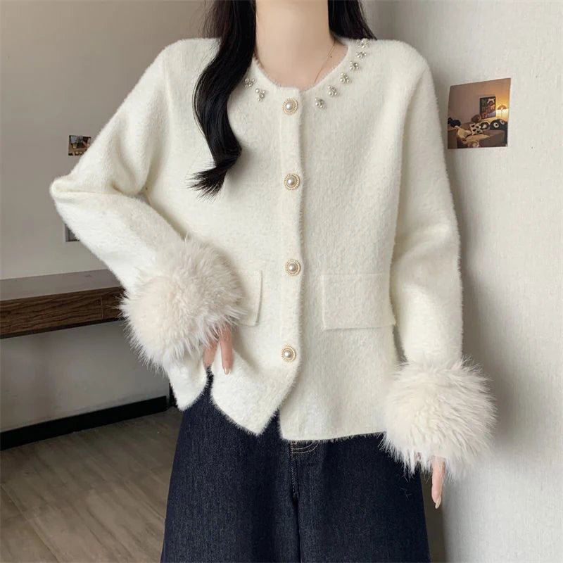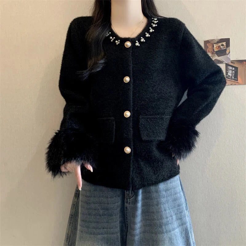 Hnewly Elegant Pearls Sweet Cardigan Women Vintage O Neck Faux Mink Cashmere Knitted Sweaters Korean Casual Long Sleeve Loose Tops