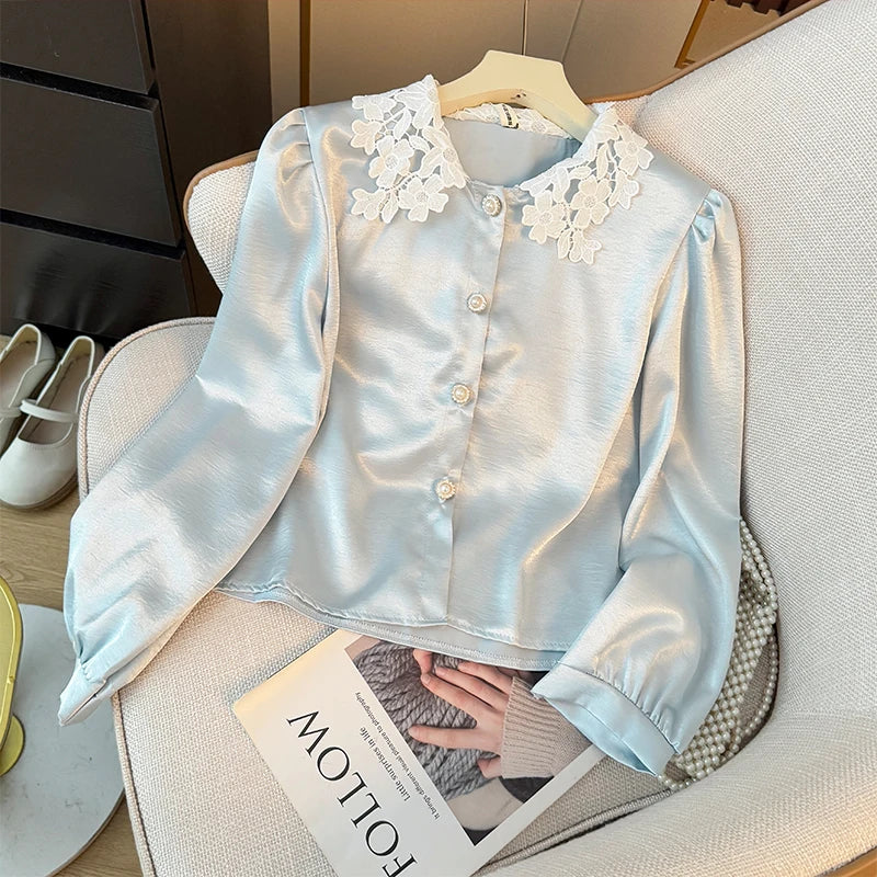 Hnewly Elegant Satin Spliced Lace Shirt Women French Style Summer 2025 Doll Collar Pearl Single Breasted Light Luxury Long Sleeve Tops