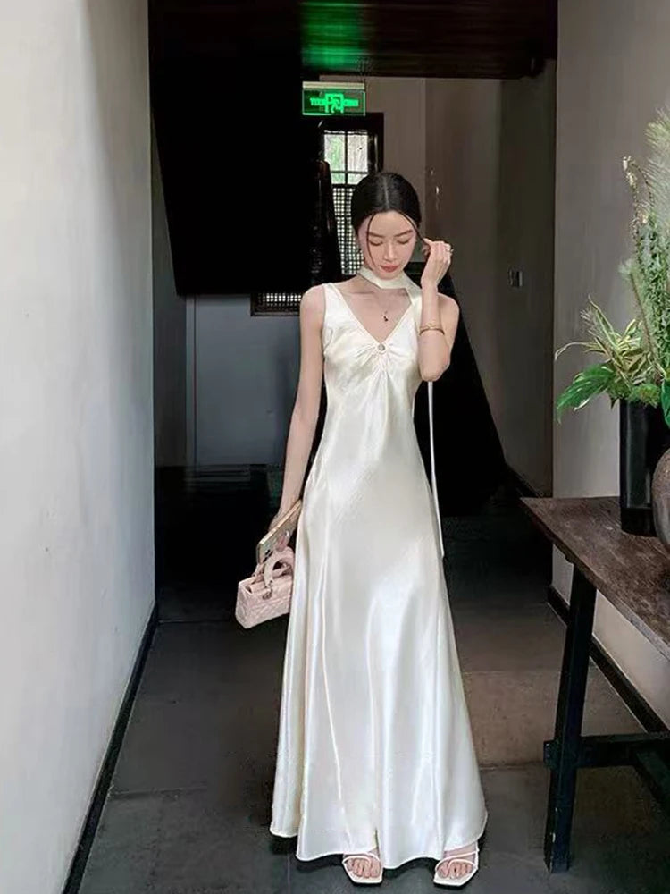 Hnewly Elegant Satin V Neck Dress Women Y2K Korean Chic Ribbon Slim Midi Dress Summer Sexy Hollow Out Folds Sleeveless Vestidos Mujer