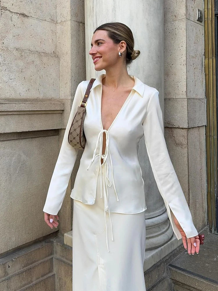 Hnewly Elegant Solid Satin Lace Up Short Shirt Women Chic Long Sleeve Deep V Neck Hollow Out blouse 2025 New Ladies Commute Office Wear
