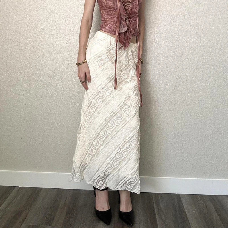 Hnewly Elegant Solid White Lace Skirt with Slit y2k Aesthetic Low Rise All-match Straight Long Skirts for Women Vintage Clothing