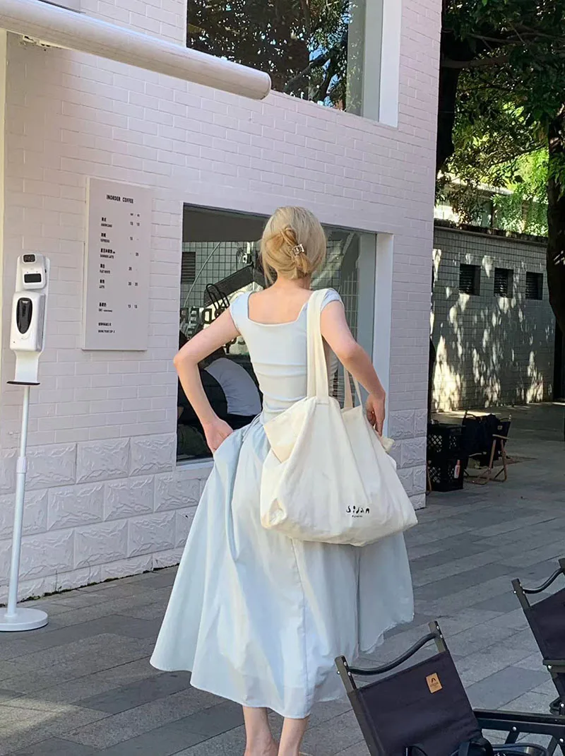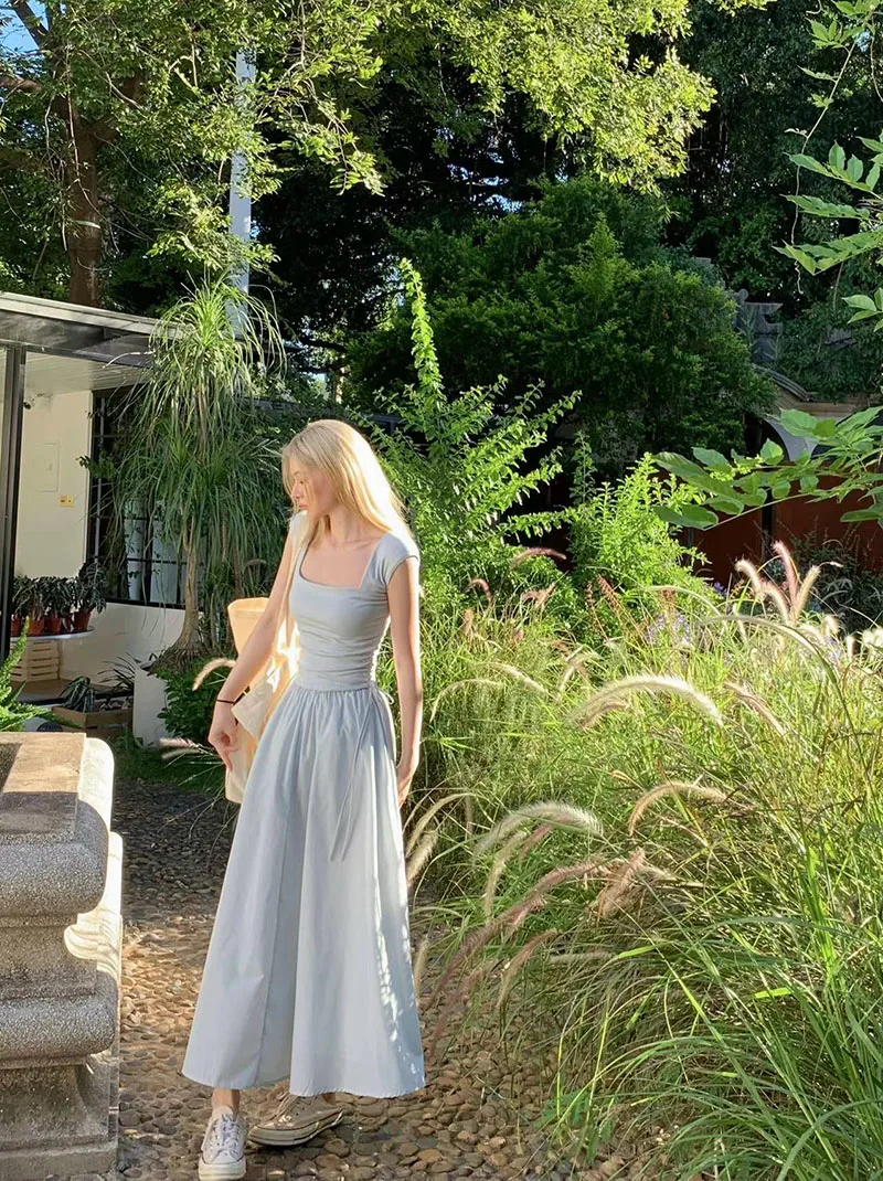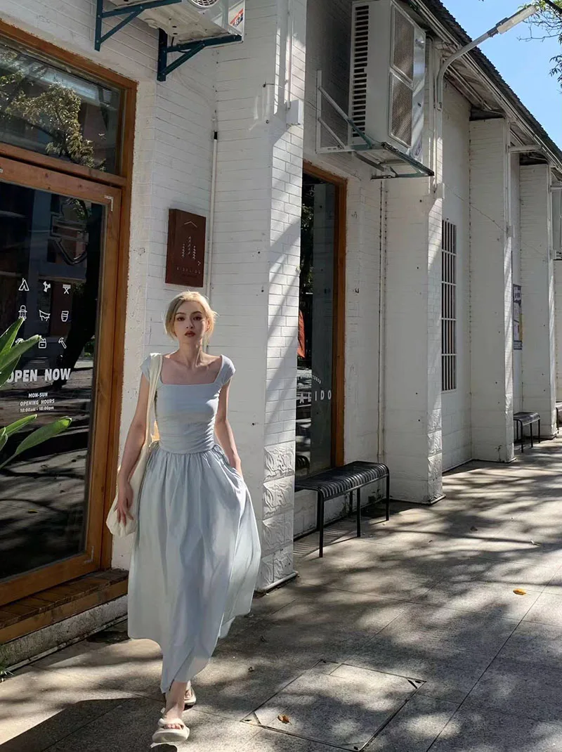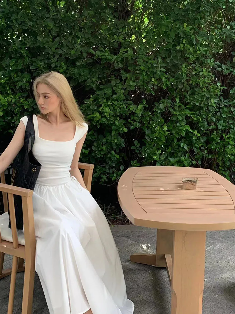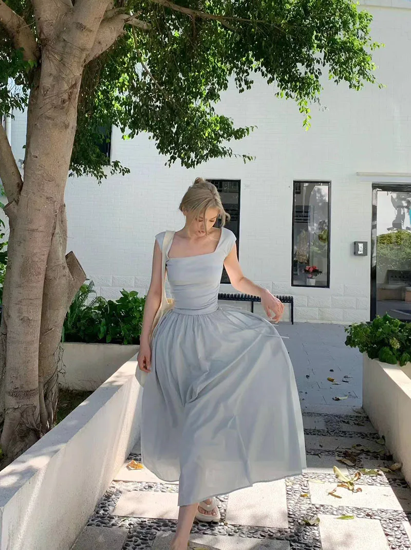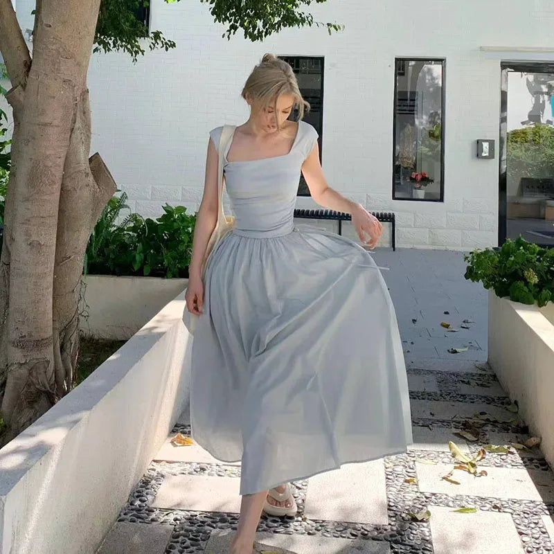Hnewly Elegant Stitching Dress Female Korean Chic Square Collar Short Sleeve Beach Party Dress Ladies High Waist All-Match A Line Dress