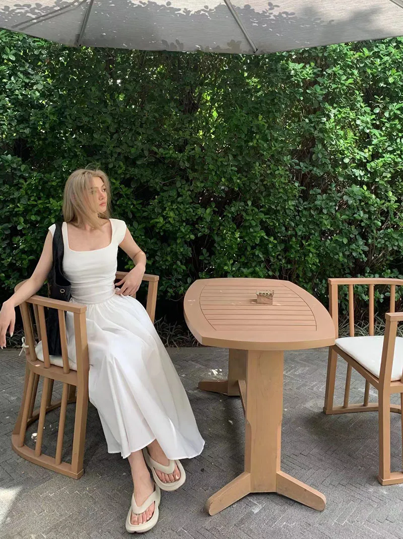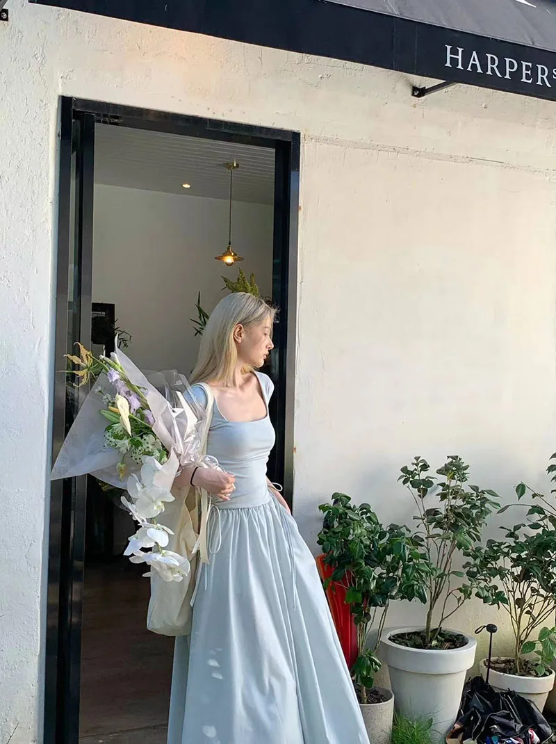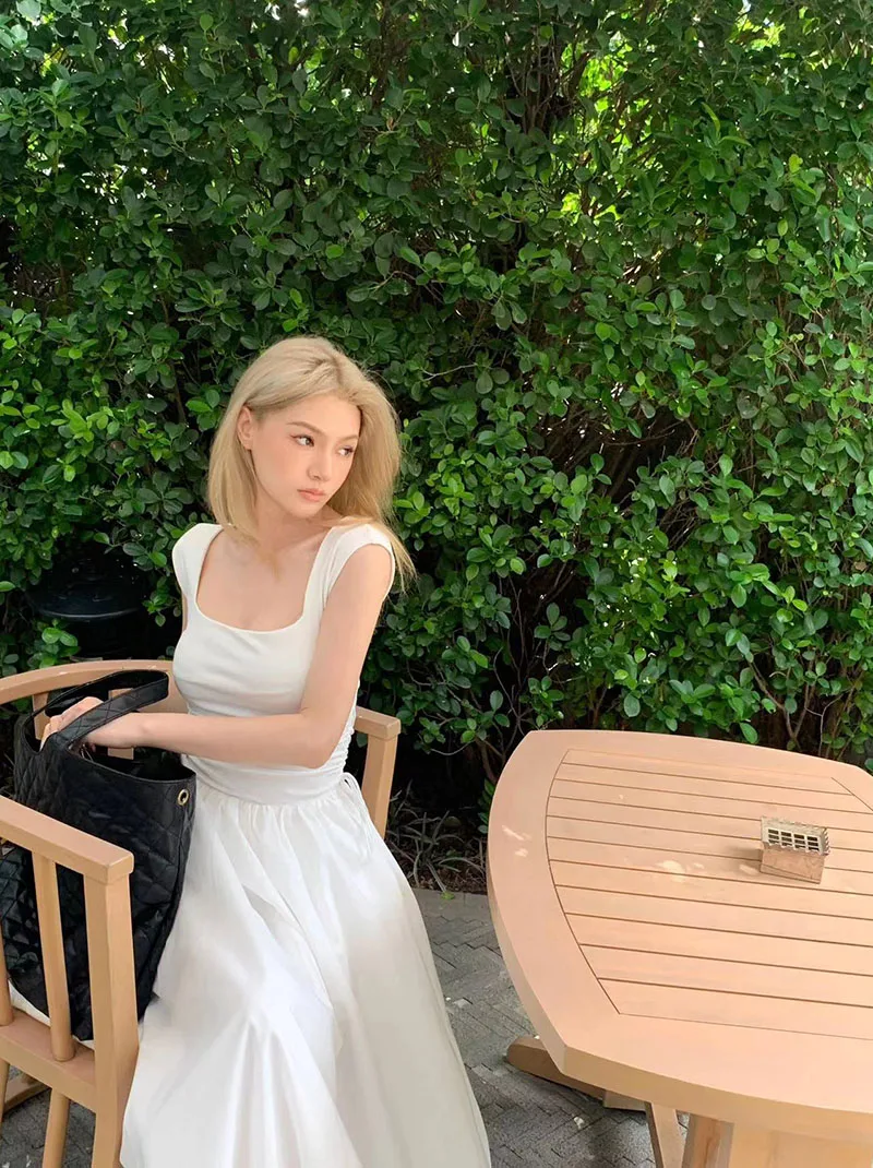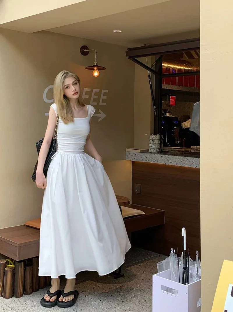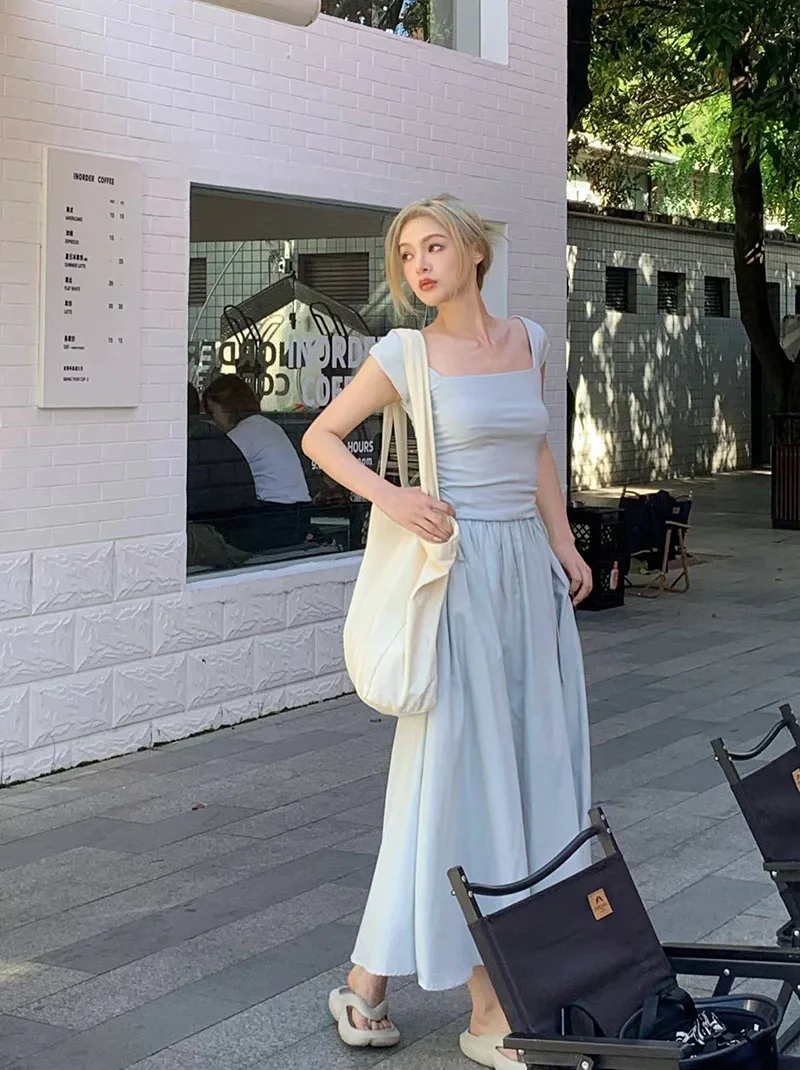 Hnewly Elegant Stitching Dress Female Korean Chic Square Collar Short Sleeve Beach Party Dress Ladies High Waist All-Match A Line Dress