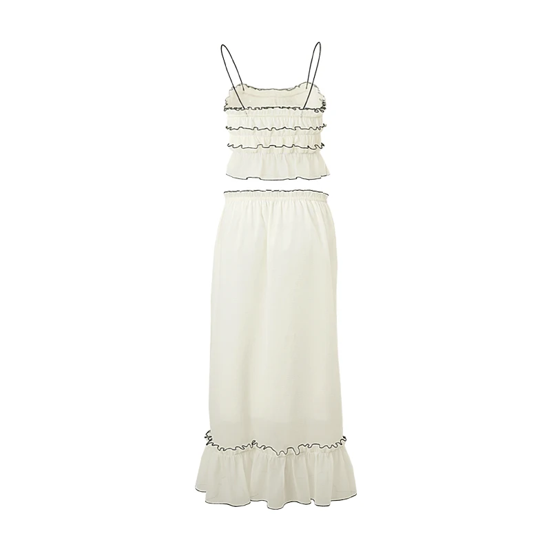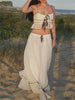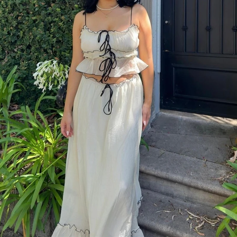 Hnewly Elegant Summer 2 Piece Set Y2K Aesthetic Lace One Line Neck Pleated Suspended Tank Top and Loose Beach Long Skirt Suit