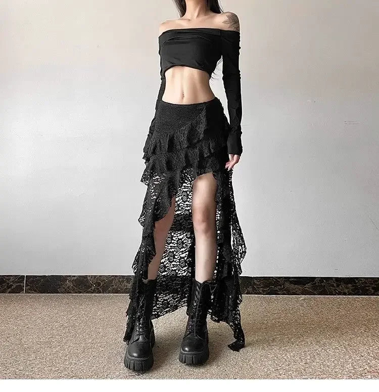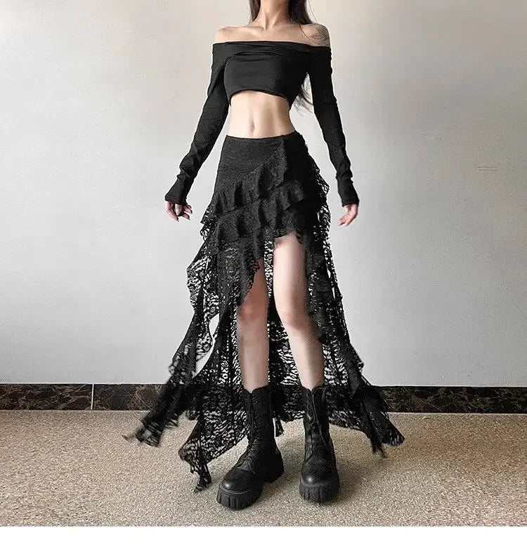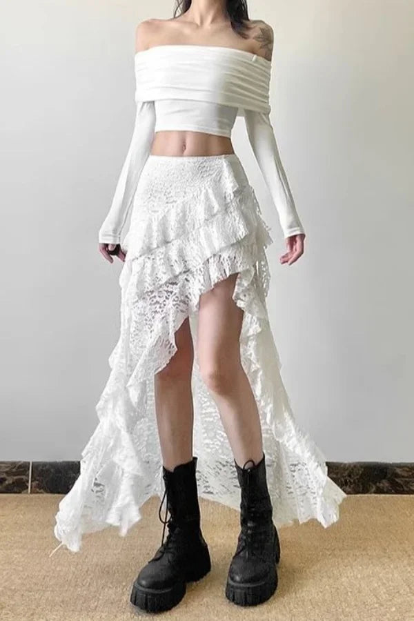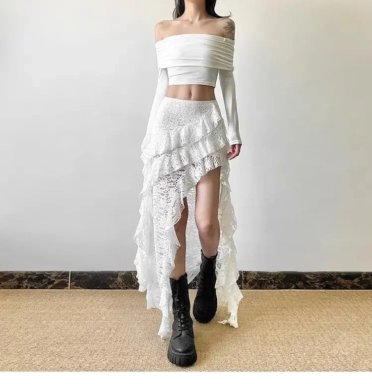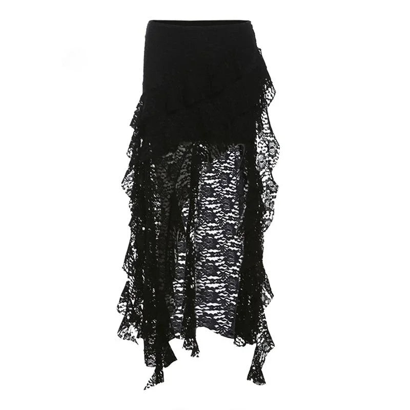 Hnewly Elegant Tulle Ruffle Skirt Women Boho Lace Vintage White Irregular Skirt Korean Style Summer Layered Mid Skirts Street