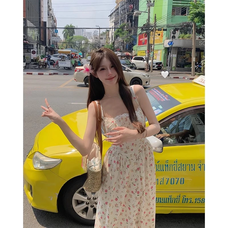 Hnewly Elegant Vintage Floral Midi Dress Women Beach Style Strap Dress Even Party Korean Fashion Clothing Y2k 2000s Bodycon Slim Summer