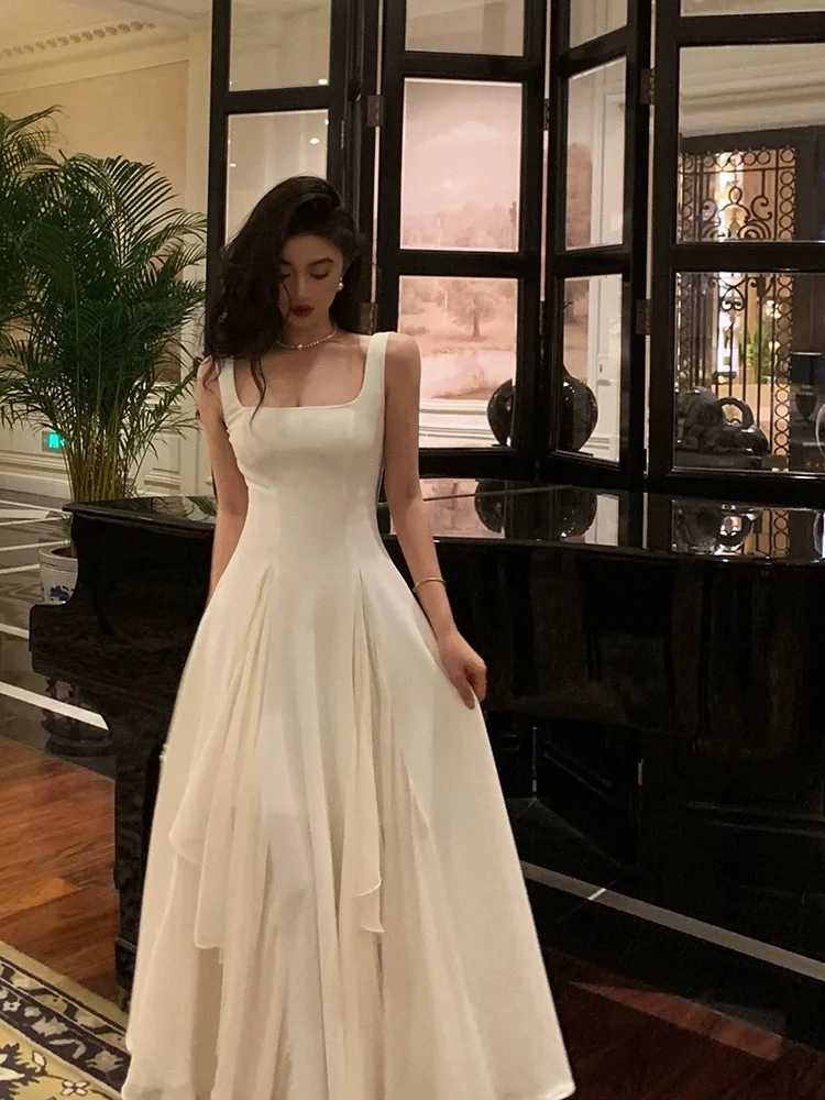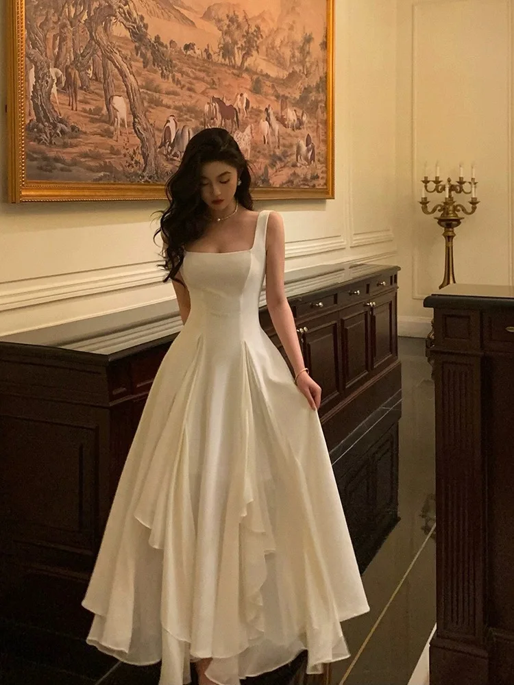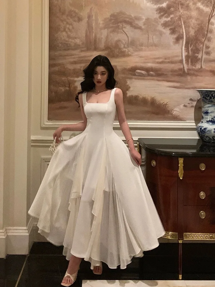 Hnewly Elegant Women White Spaghetti Strap Midi Dress French Ruffles Slim Waist A-line Pleated Vestidos Vintage Evening Party Robe