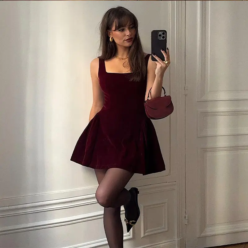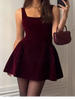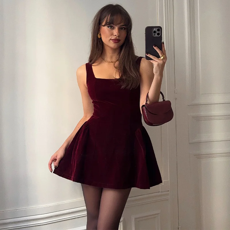 Hnewly Elegant Women's Dress Halter Sleeveless A-line Velvet Solid Female Evening Dresses Autumn Fashion Chic Party Lady Mini Robe