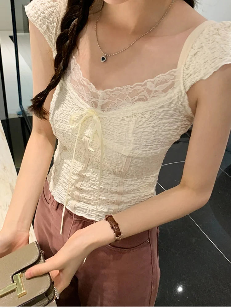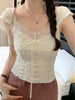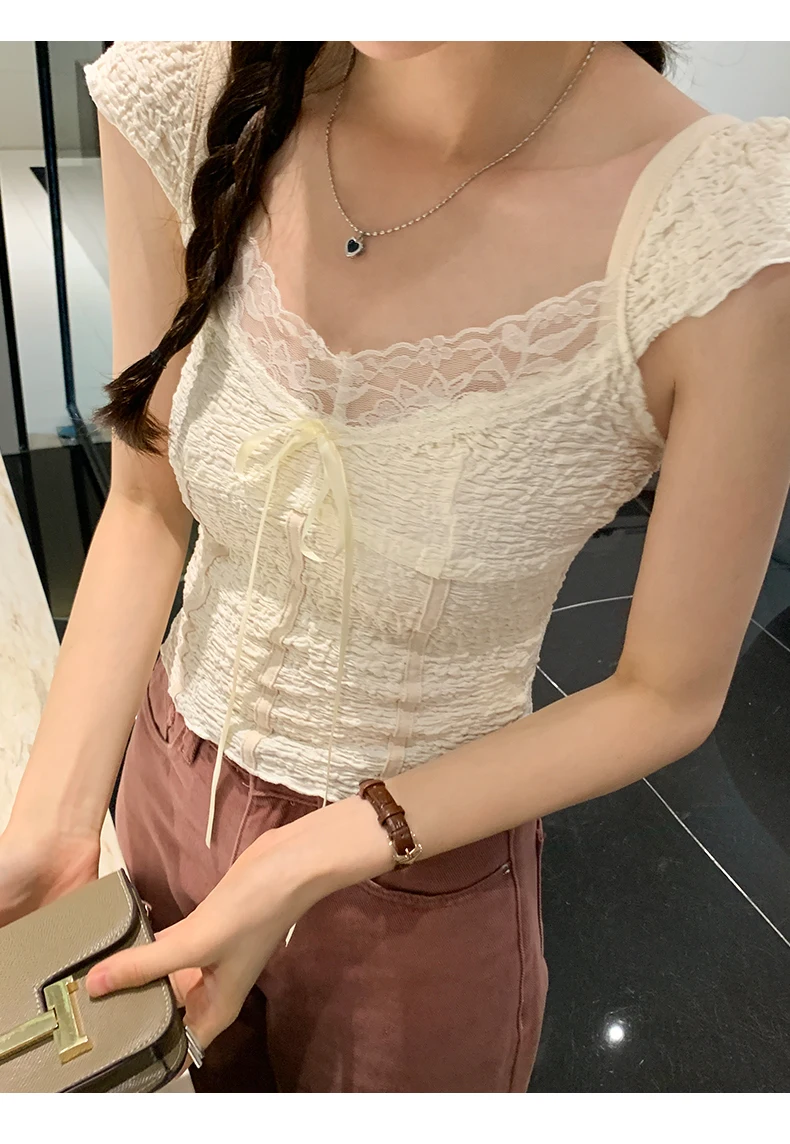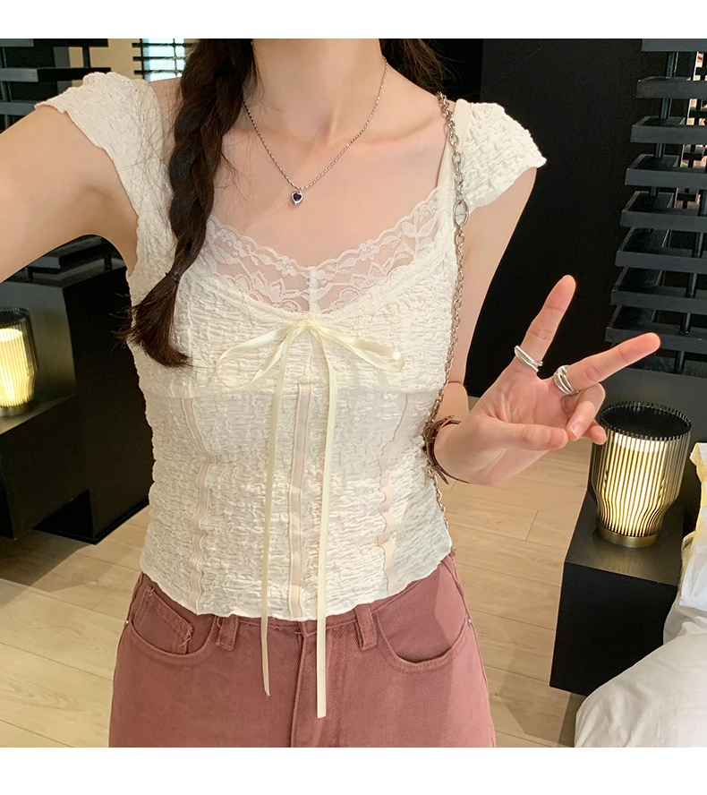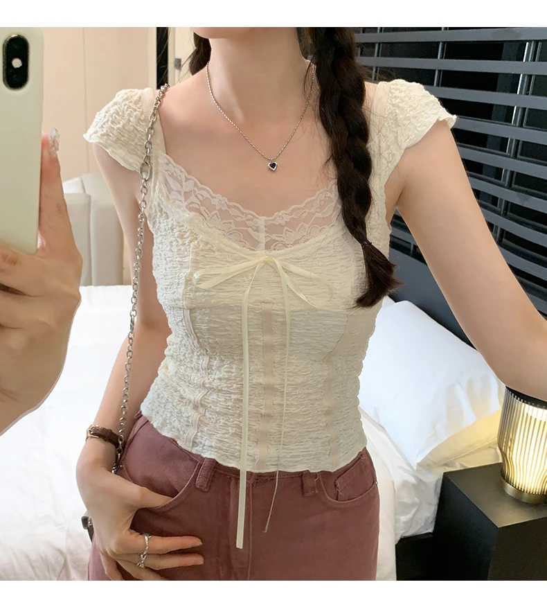 Hnewly Faionable Lace ort Sve V-Ne T-irt Women's Summer New Sle Korean Version Slim Fit Pure Color Moisture ng