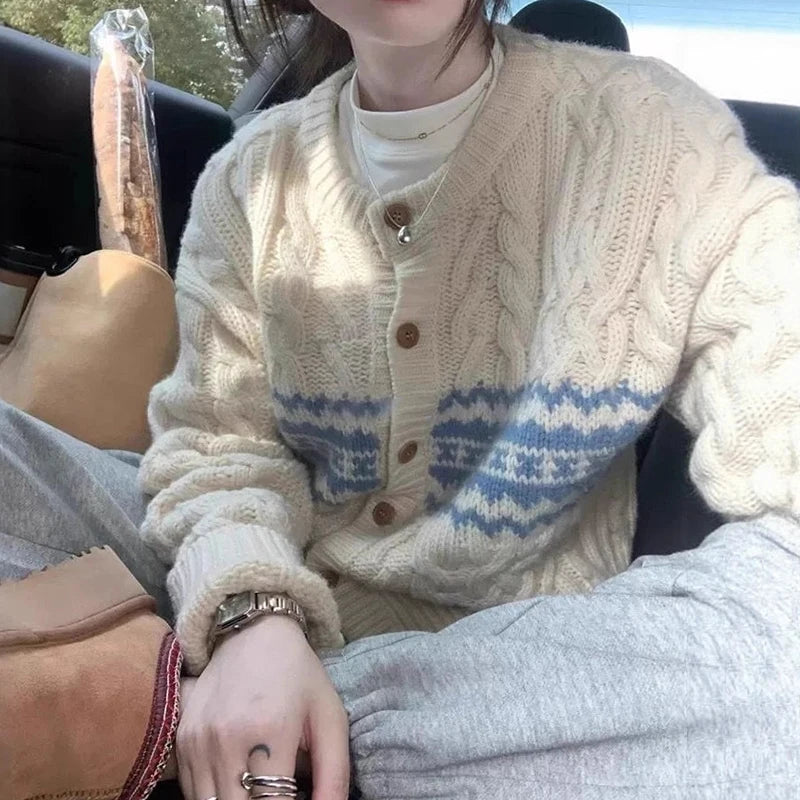 Hnewly Fair Isle Cardigan for Women Comfy Cable Knit Button-up Sweater Jacket Cozy Knitwear Teen-girl Fall Winter Vintage Outfit