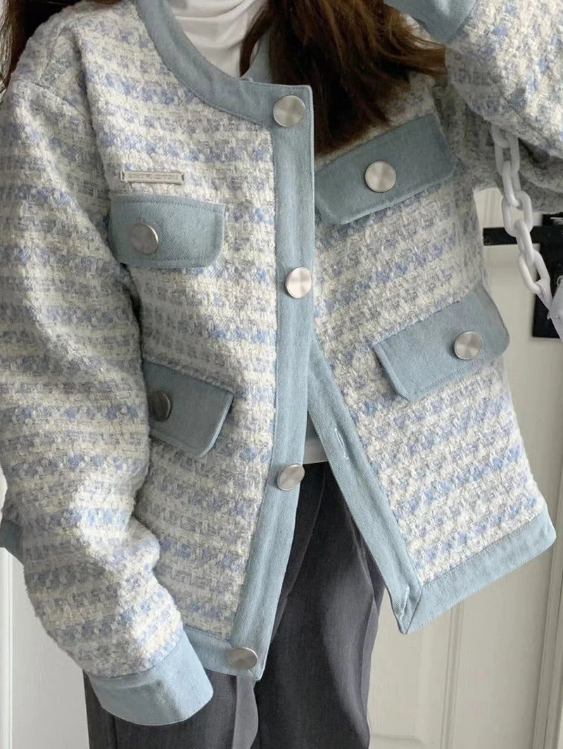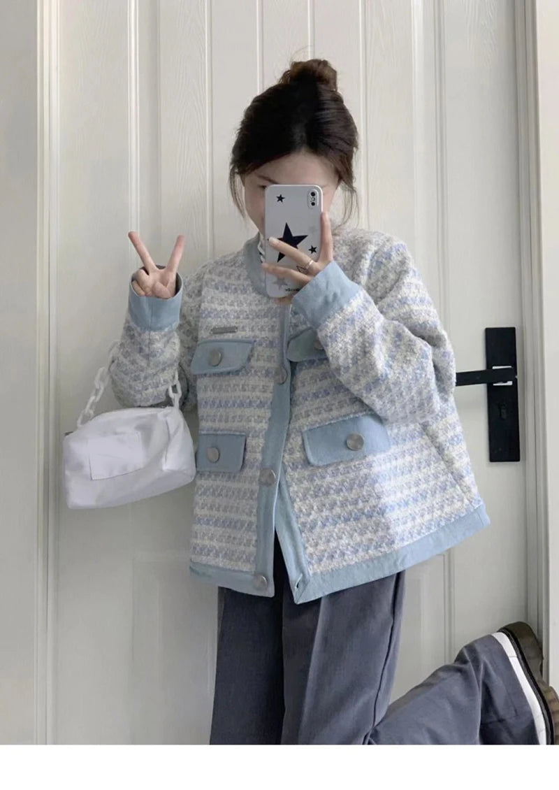 Hnewly Fall Women Sweet Tweed Jacket Vintage Casual Long Sleeve Elegant Coat French Cute O Neck Women Fall Winter Retro Tops New