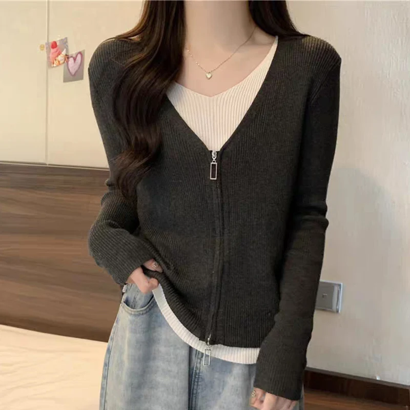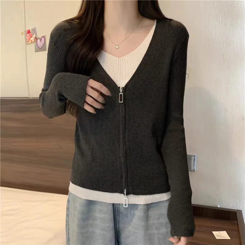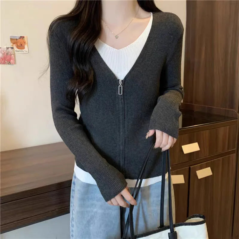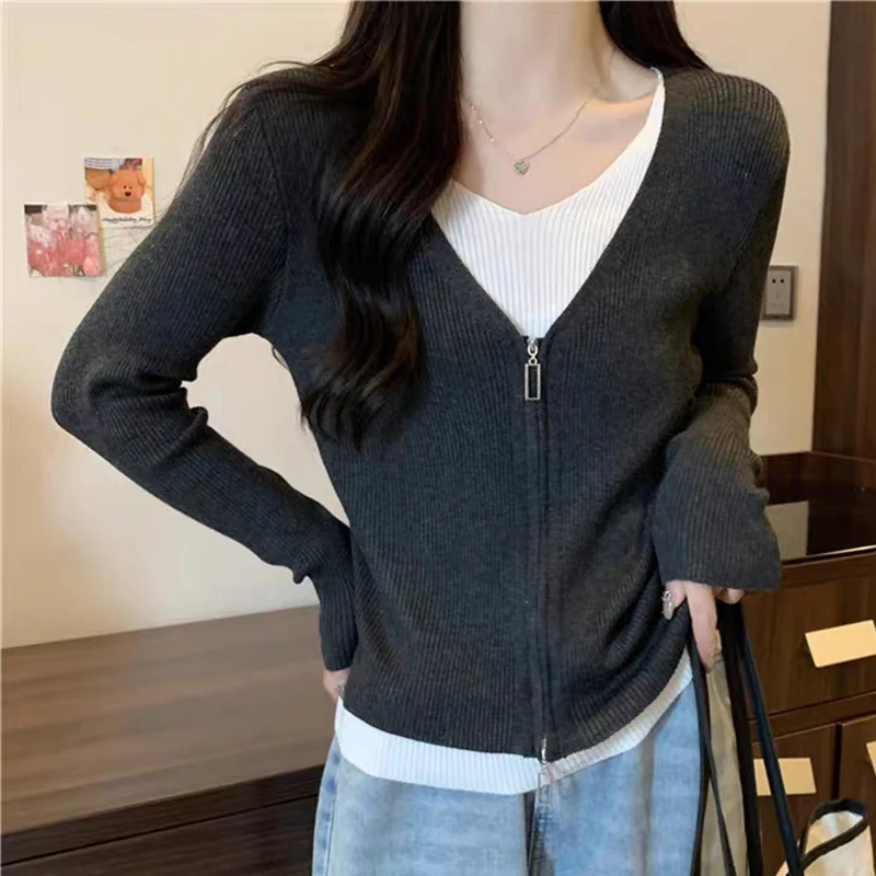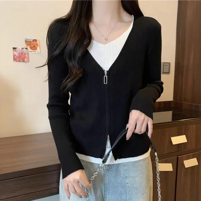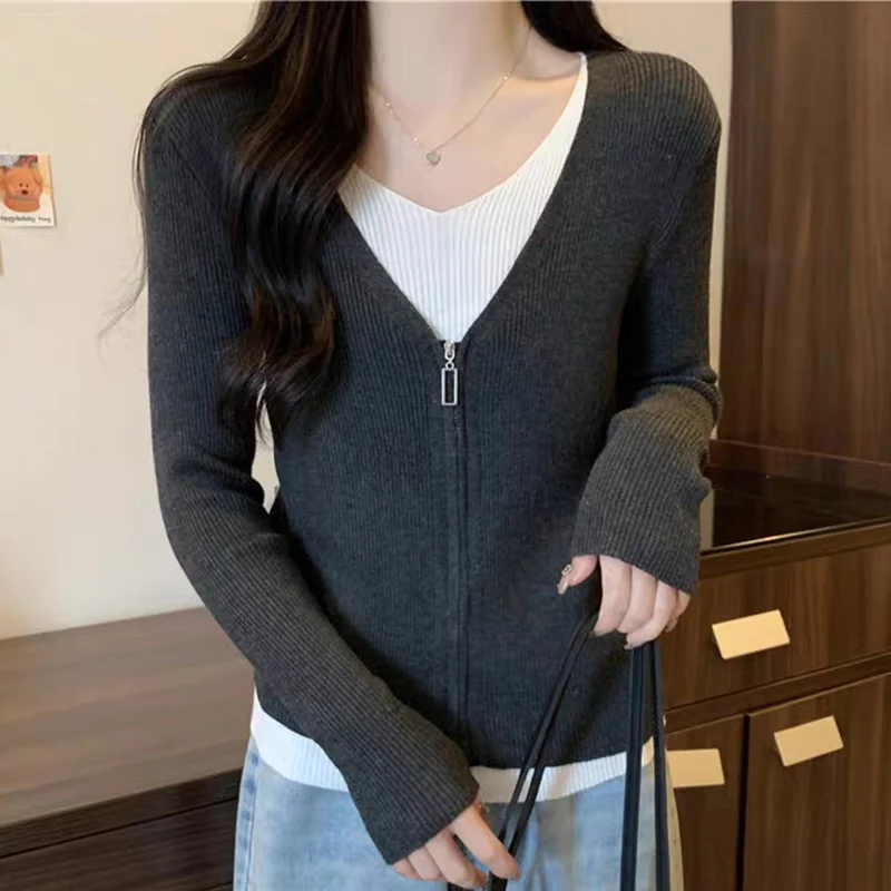 Hnewly Fashion False Two Pieces Sweater Women Spring Autumn Mix Color V-Neck Knitted Jumpers Woman Slim Long Sleeve Pullovers Mujer