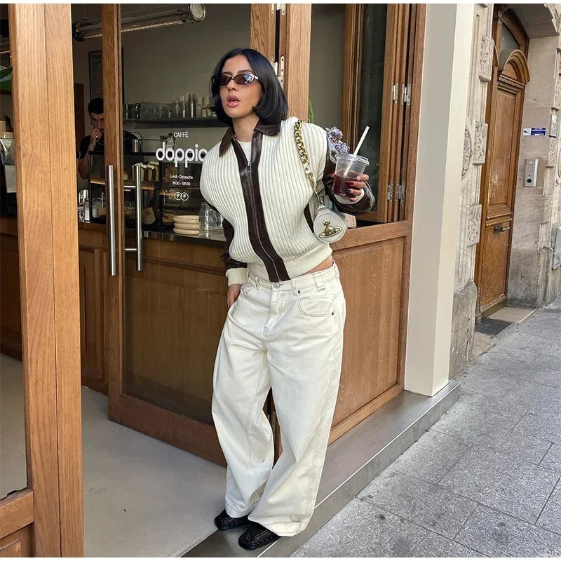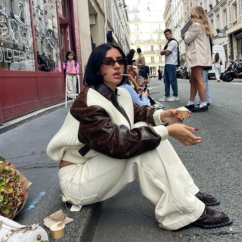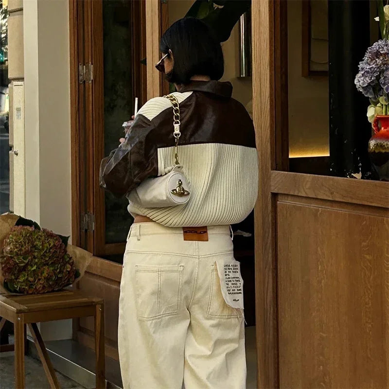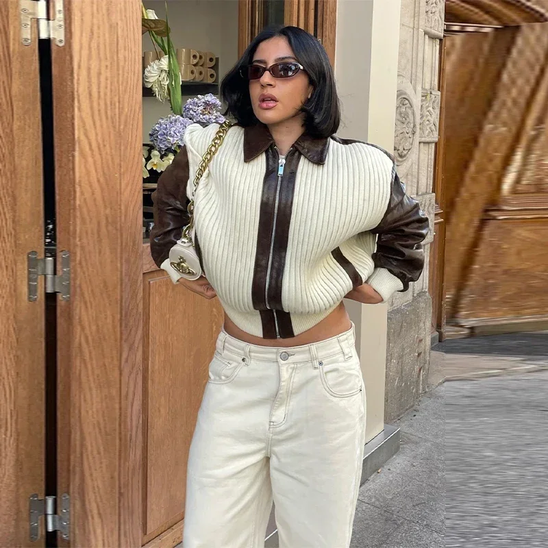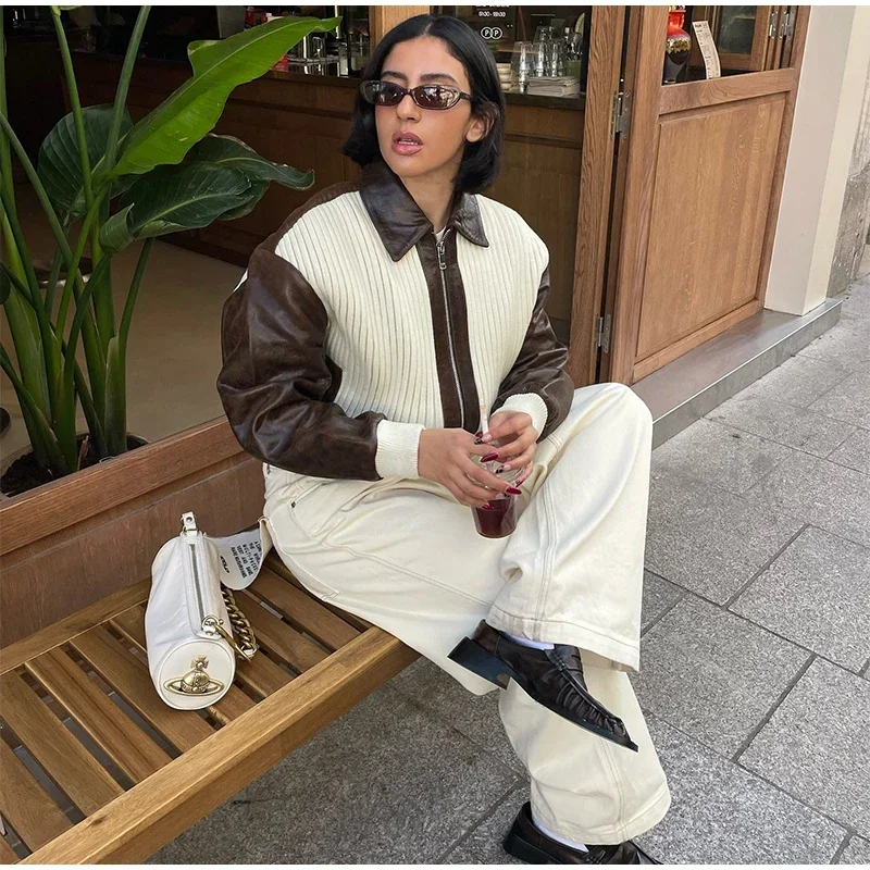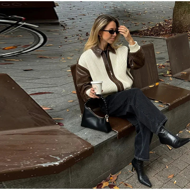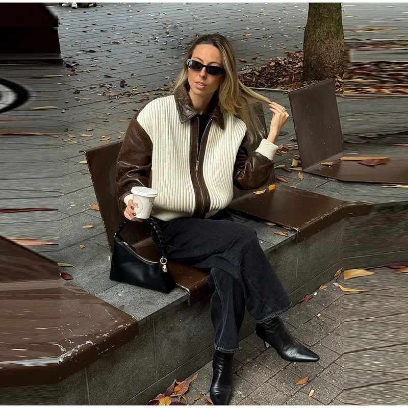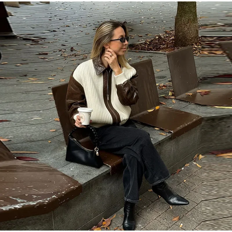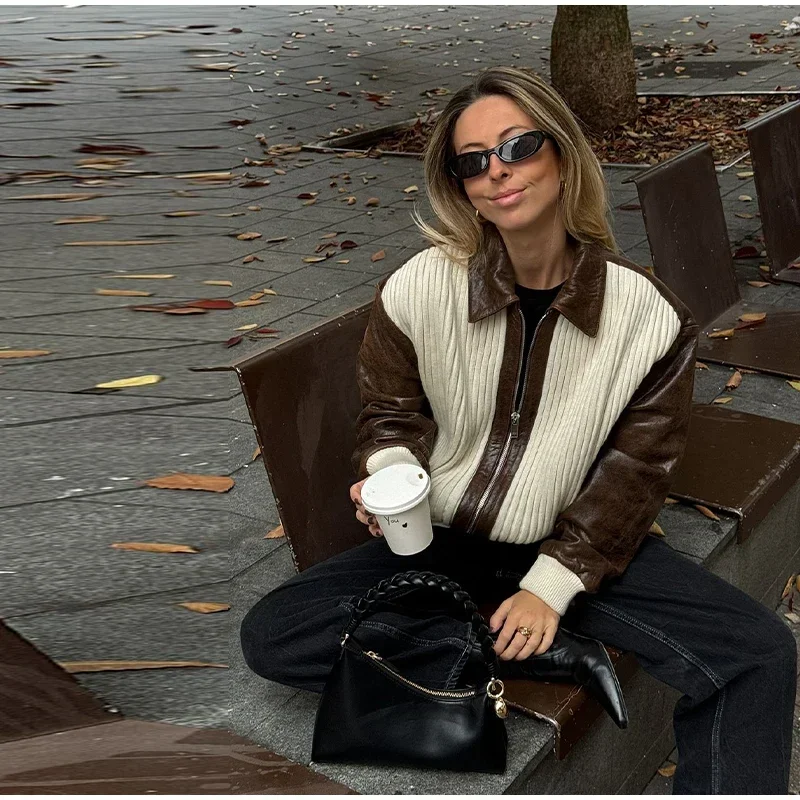 Hnewly Fashion Knit Patchwork Leather Jacket Women Lapel Full Sleeve Zipper Pockets Contrast Coats Autumn Winter Lady Street Coat