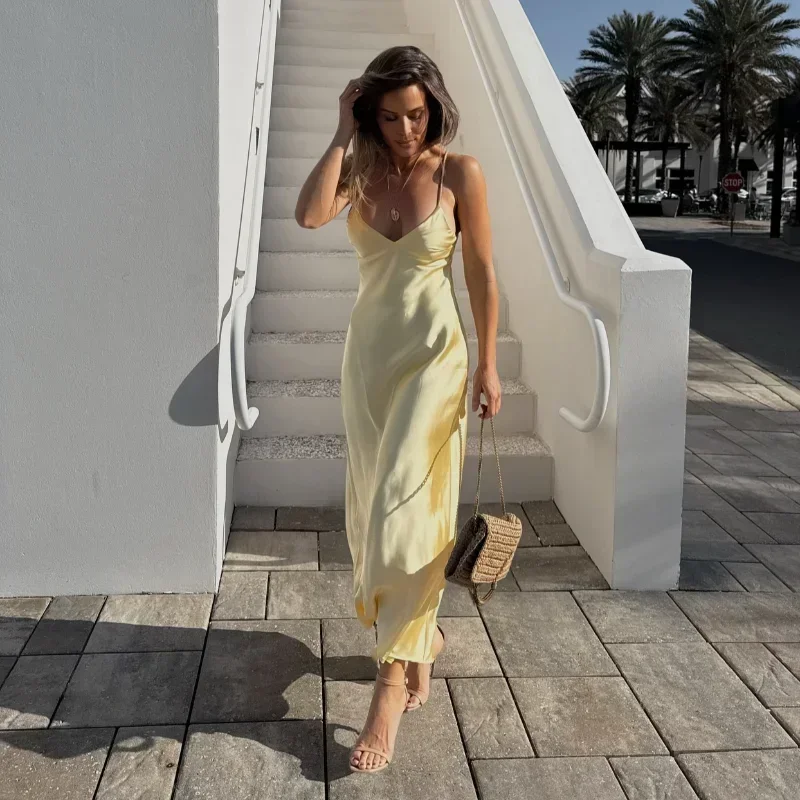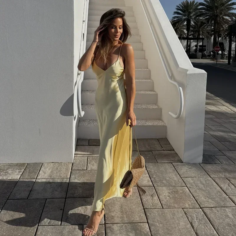 Hnewly Fashion Solid Stain Sling Maxi Vestido Chic Sleeveless Backless V Neck Off Shoulder Slim Dress 2025 New Summer Lady Evening Wear
