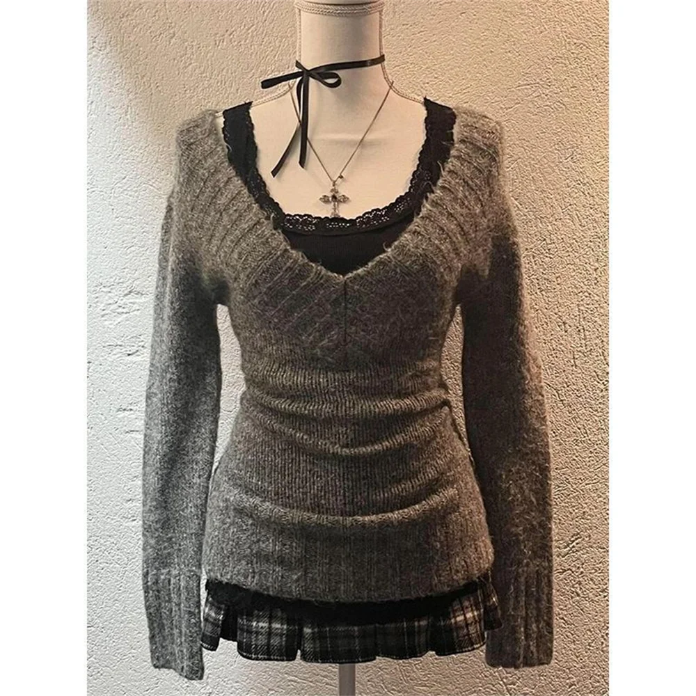 Hnewly Fashion Vintage V-neck Knitted Tops Women Early Autumn Winter New Sweaters Slim Long Sleeve Pullovers Lace Vest 2 Piece Set