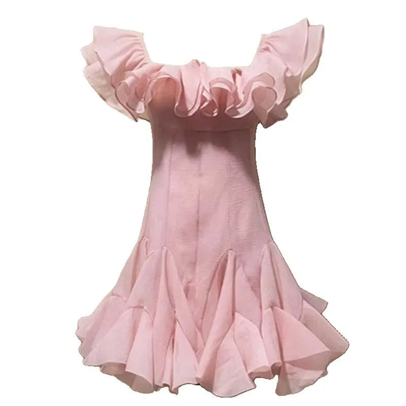Hnewly Fashion Women Dress Sleeveless Slash Neck Solid Color Lotus Leaf Edge Design Female Party Dresses New Tide