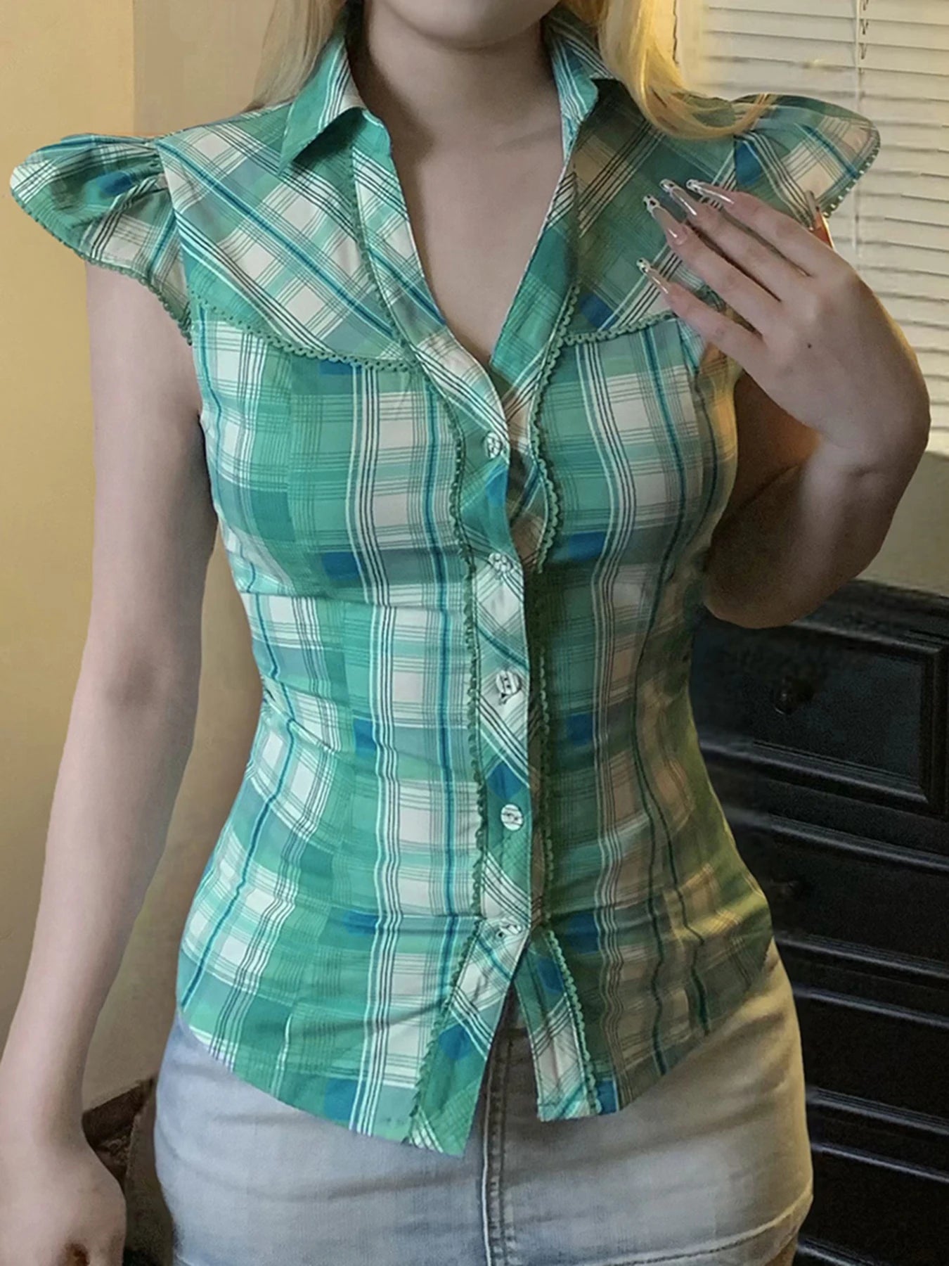 Hnewly Fashion Y2k Lace Spliced Plaid Prints Women Shirts Shorts Sleeves Retro Chic Design Summer Polo Blouses