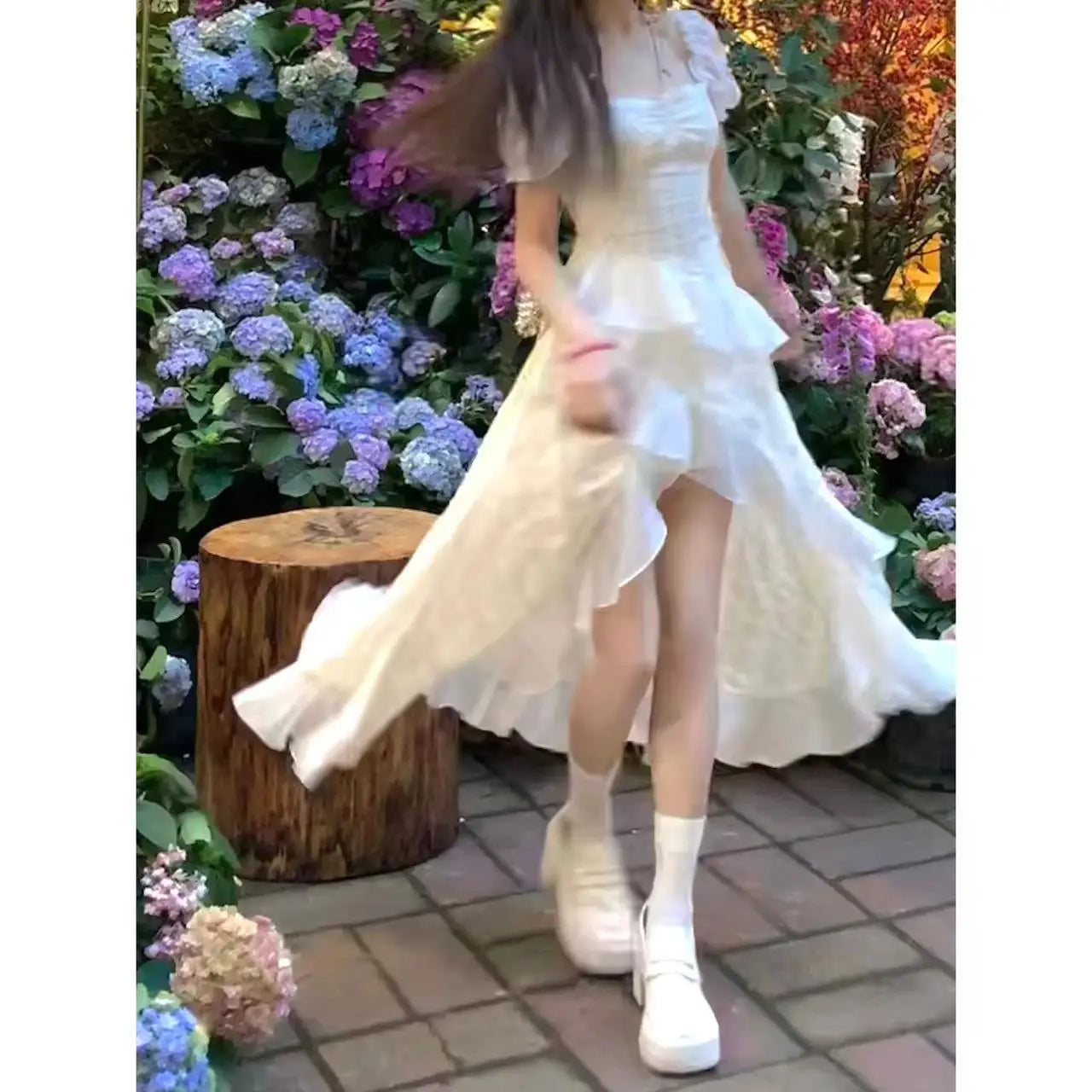 Hnewly French Elegant Party Midi Dress Women Beach Style 2000s Vintage Y2k Clothing Short Sleeve One Piece Dress Korean Fashion Summer
