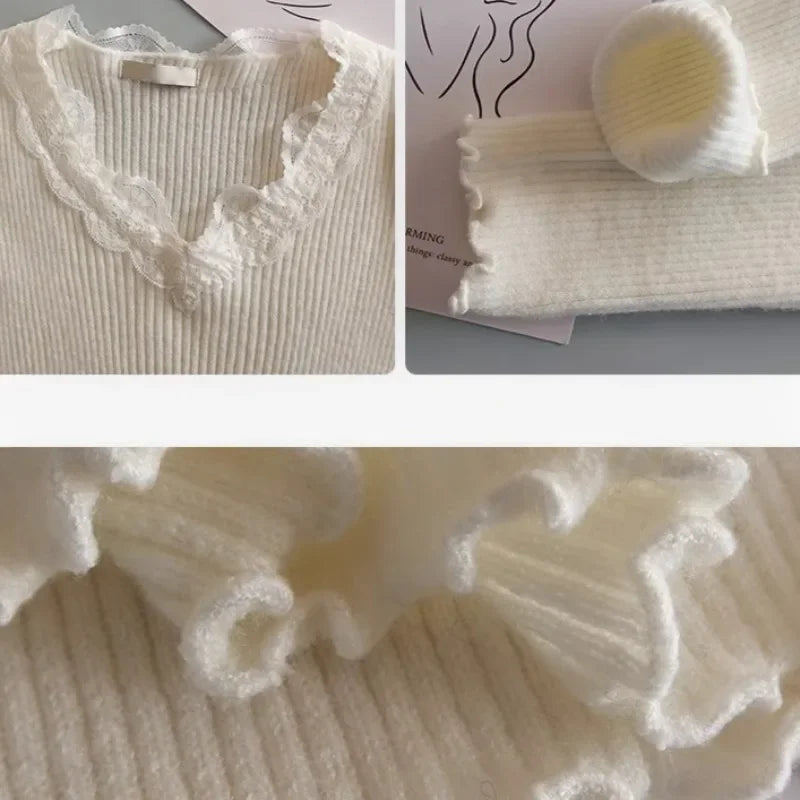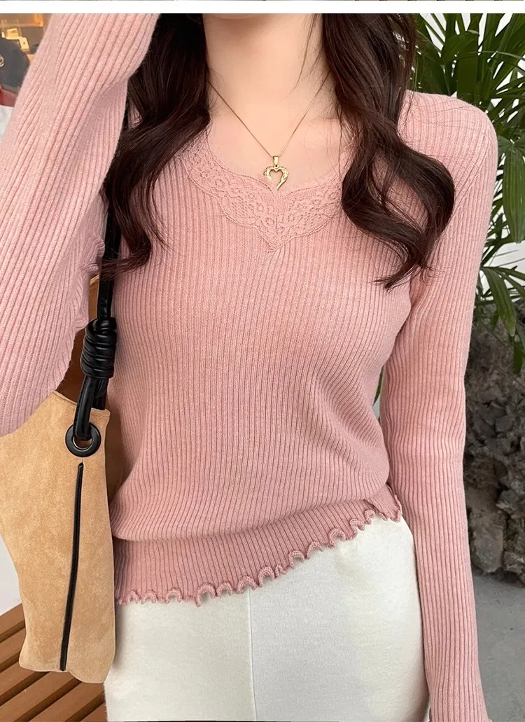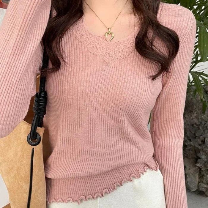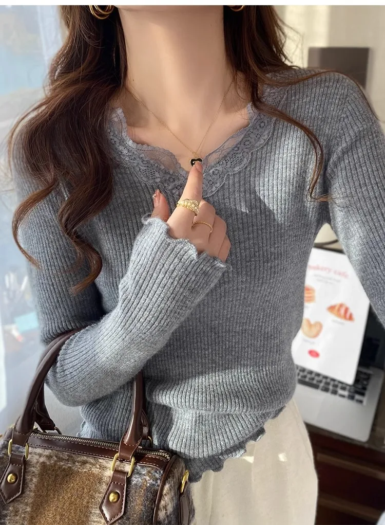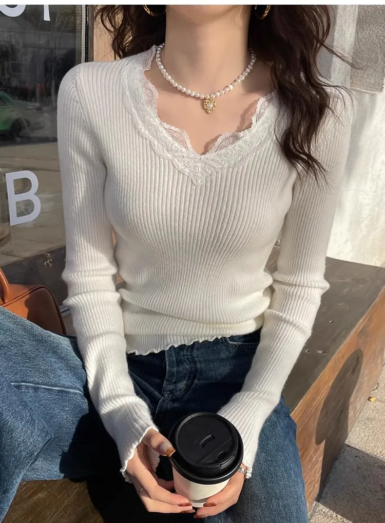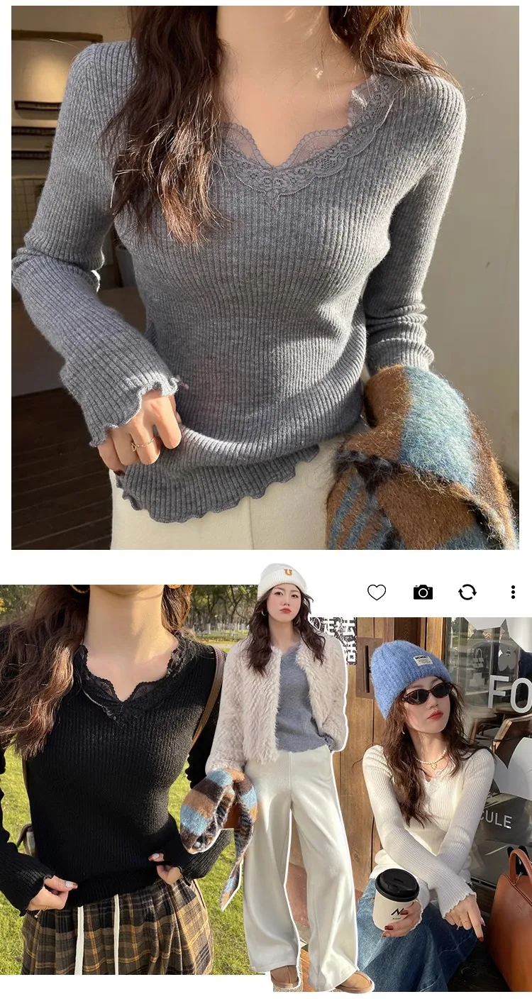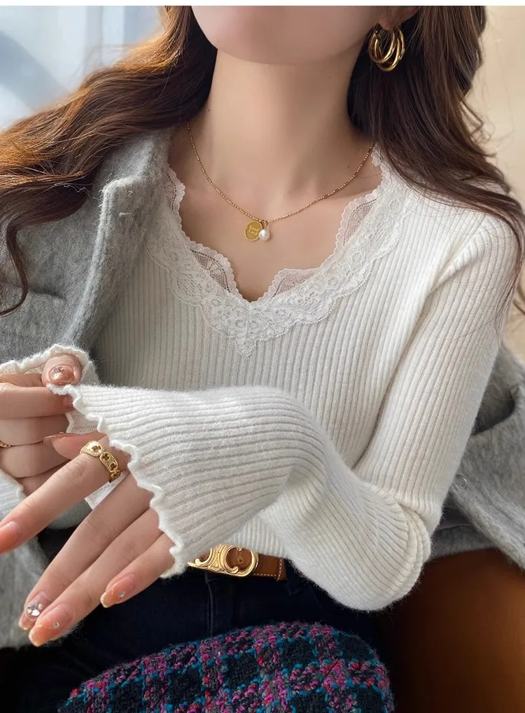 Hnewly Gentle Sweater Women Lace V-neck Basic Knitted Pullovers Comfortable All-match Streetwear Spring Fall Fashion Soft Design Sweet