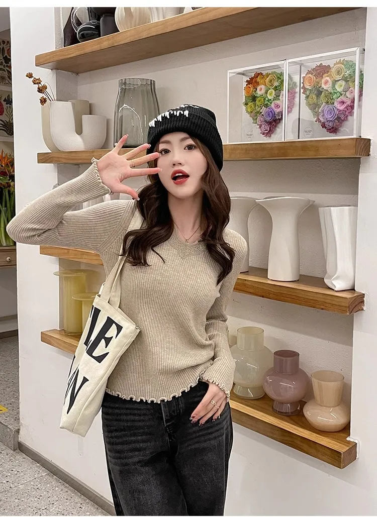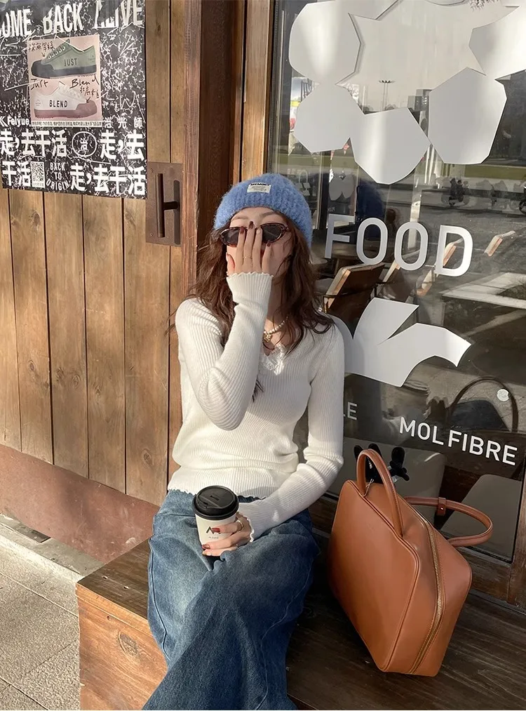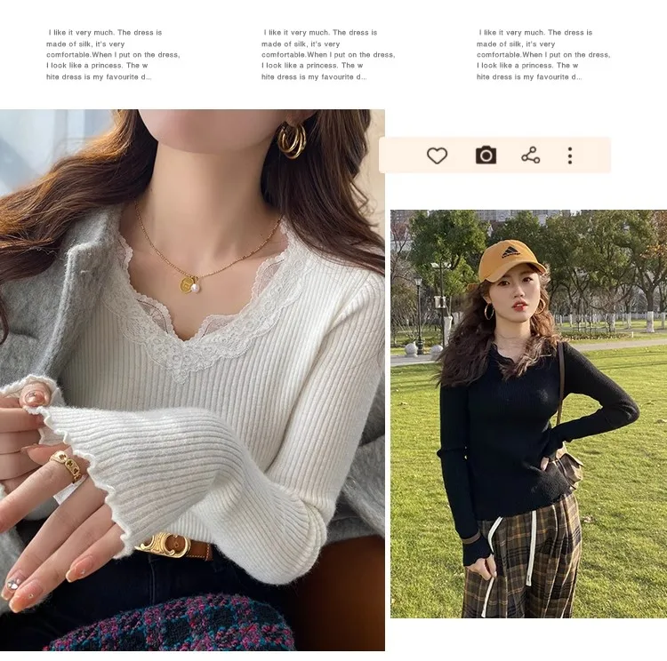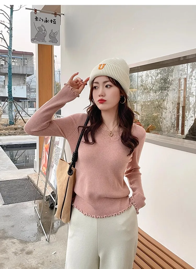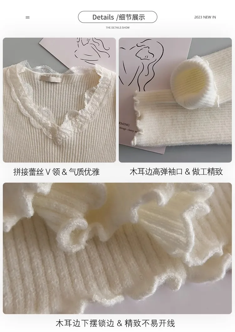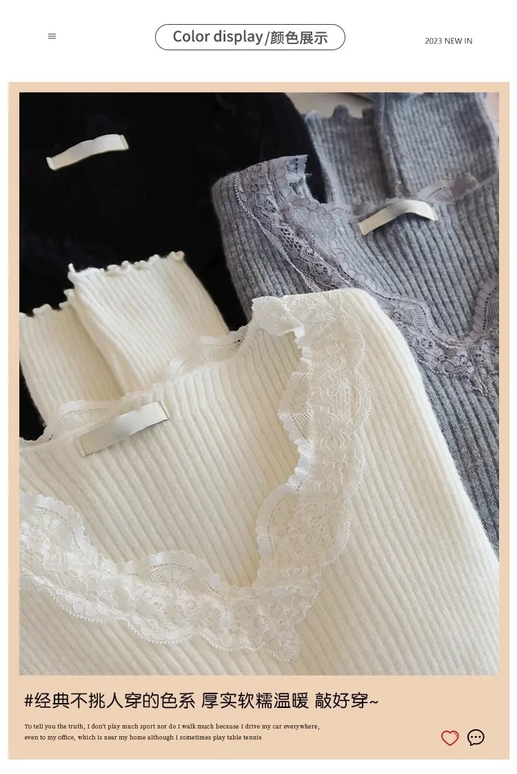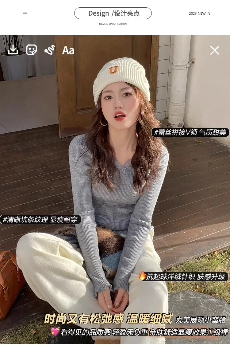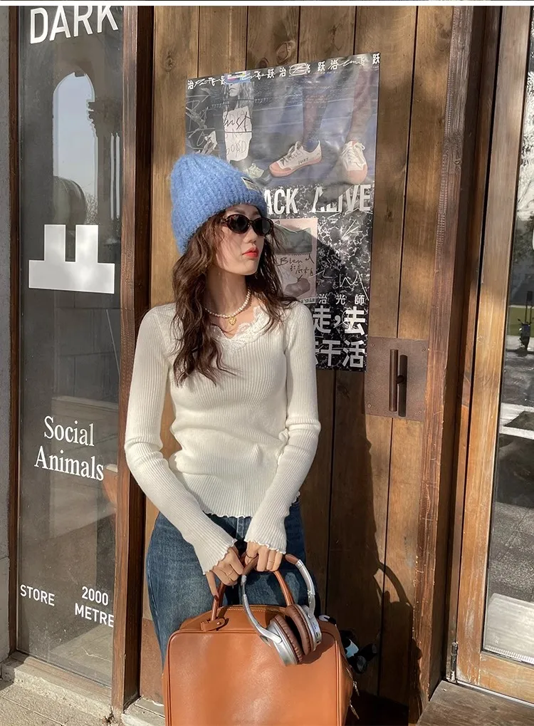 Hnewly Gentle Sweater Women Lace V-neck Basic Knitted Pullovers Comfortable All-match Streetwear Spring Fall Fashion Soft Design Sweet
