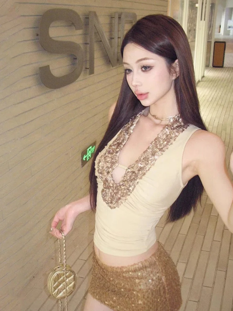 Hnewly Glitter Tank Tops Women Y2K Sequins Ruched Deep v-Neck Skinny Elastic Chic Basic Classic Summer Trend Street Vest