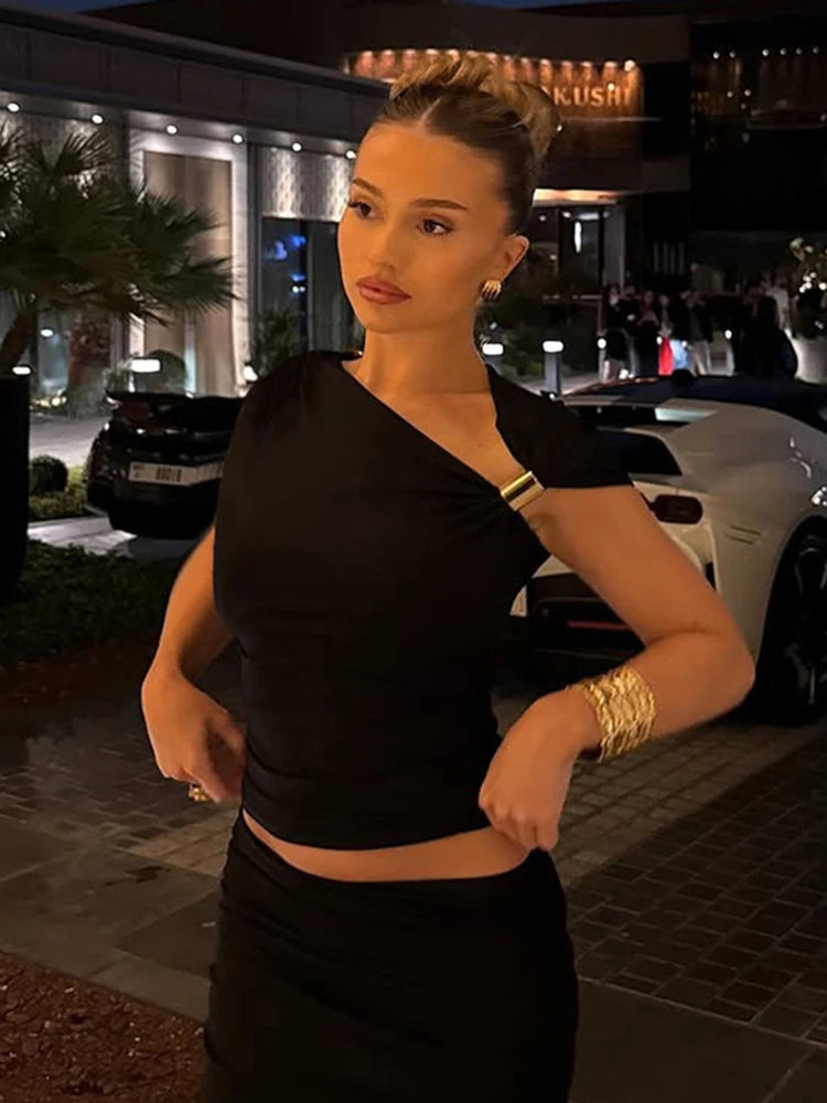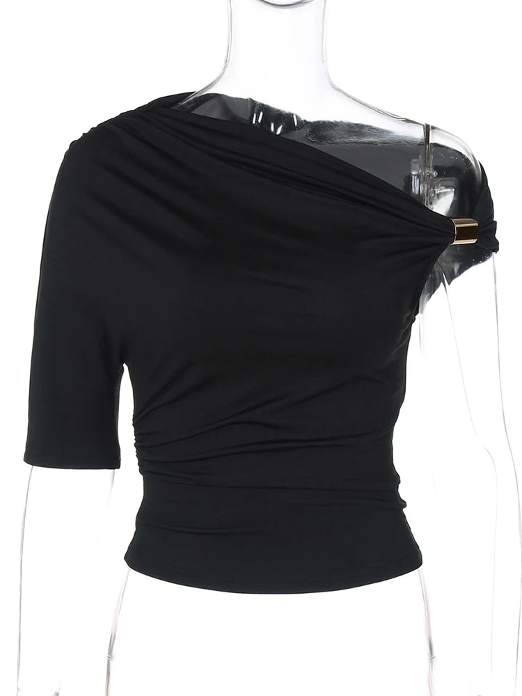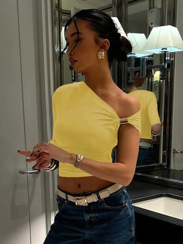 Hnewly Gold Ring Off Shoulder T shirt Female Solid Color Irregular Ruched Top Slim Sexy Navel Expose Tanks Hot Girl Y2K T shirt