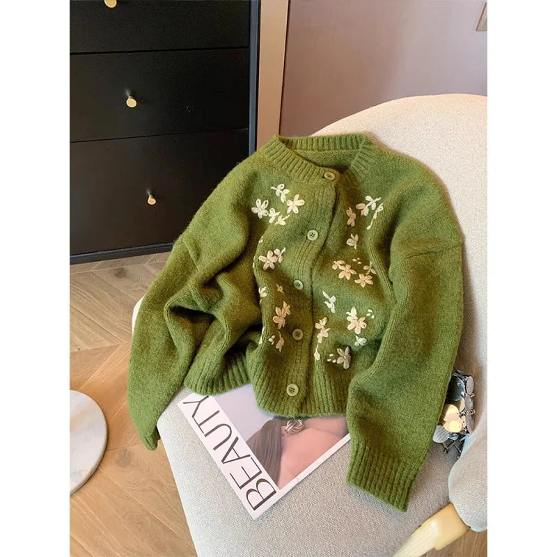 Hnewly Green Crochet Knitted Sweater Women's Retro Soft Embroidery Loose Long Sleeved Jacket Round Neck Single Breasted Cardigan Top