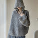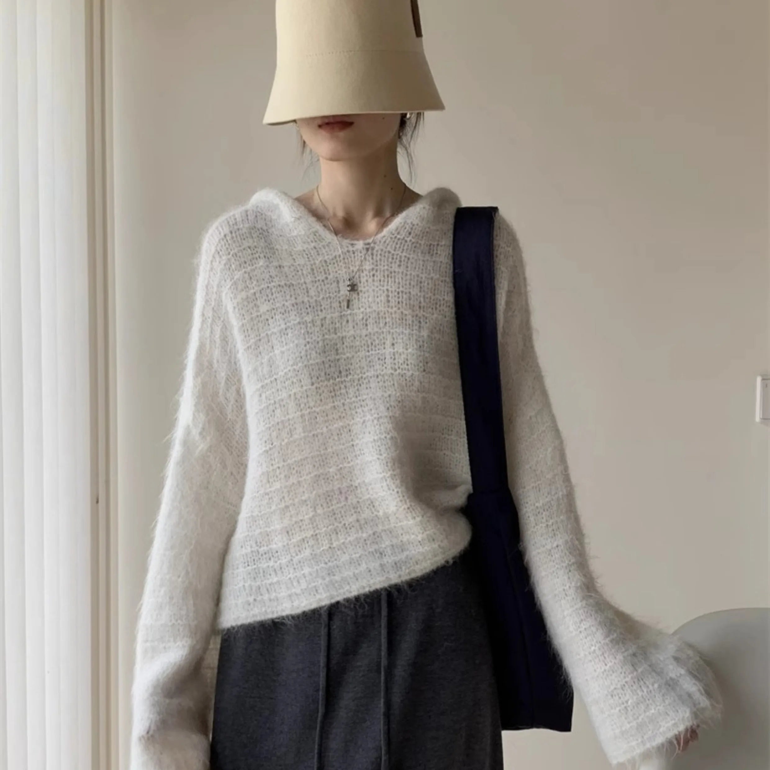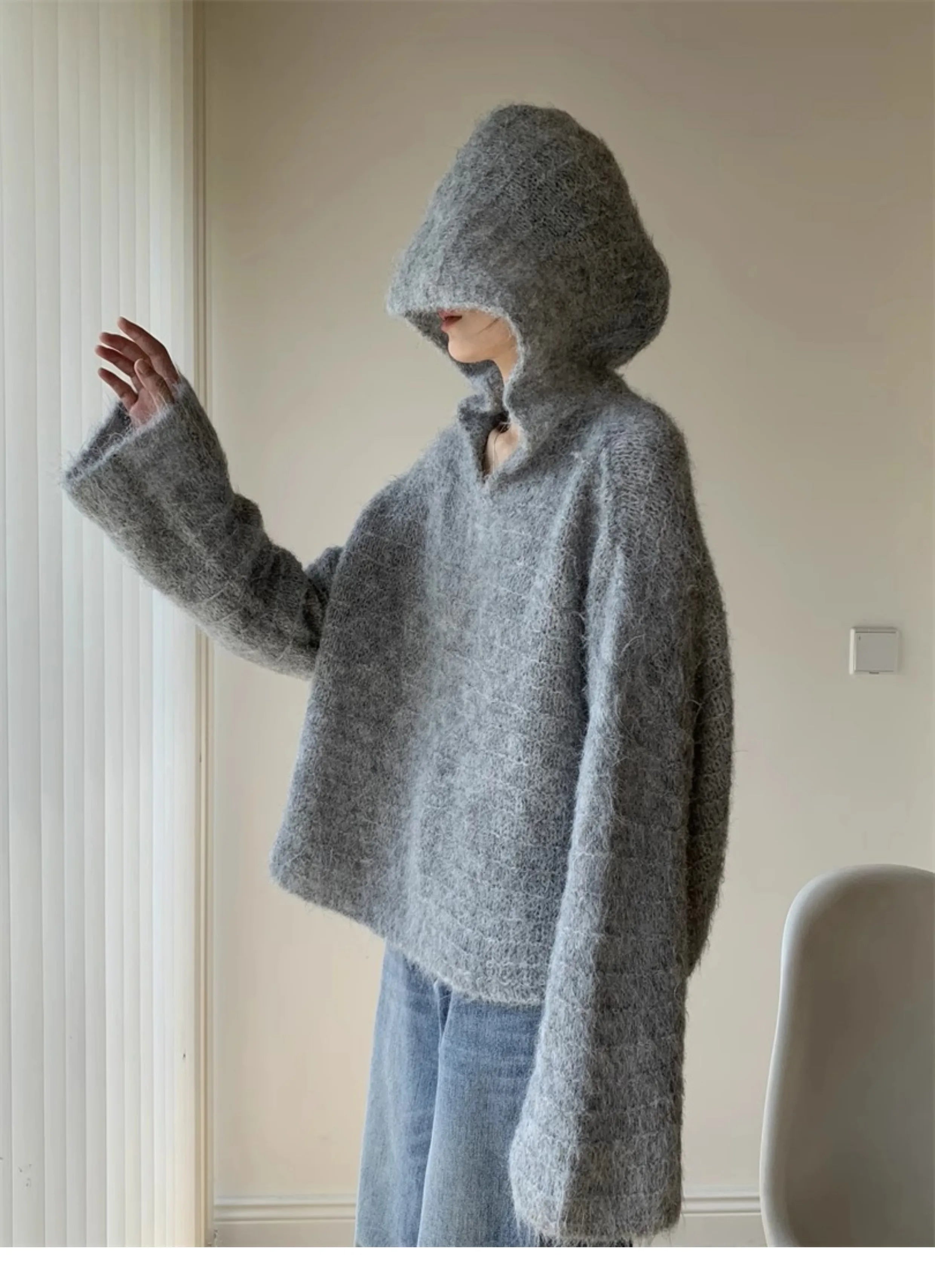 Hnewly Grey Mohair Knit Hooded Sweater for Women Loose Bell-Sleeve Pullover Hoodie Female Autumn Winter Casual Chic Outfit